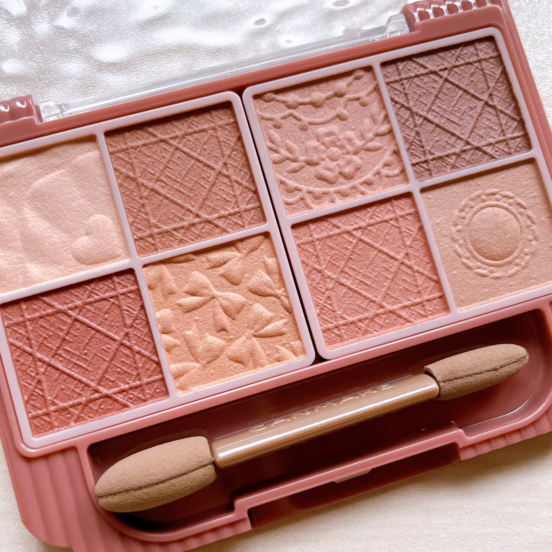 - いつでも一緒♡多色なのに持ち歩ける! 8色入りアイシャドウパレットのマットタイプ♪ 多色パレットでありながら、「持ち歩けること」と「外出先でもメイク直しができること」にこだわったアイシャドウパレット。 ダブルエンドチップ付です♪ マットが大好きな方にも、少し苦手意識がある方にも手に取っていただきたく全色マットor1色ラメ入りの構成にしています♪ (M01:全色マット、M02・M03:1色ラメ入り) 全体は同系色で統一しており、全色使いやすいパレット。 色の組み合わせは自由に♡自分好みのメイクを楽しめます! 【マット】 隠ぺい感とふわっと感を両立させた質感♪ なめらかで重ねても粉っぽくなりにくく、厚塗り感のない仕上がり。 伸びが良いのでムラになりにくく、しっとりフィットして仕上がりを長時間キープ✨ 【ラメ】 ラメ・パールだけがのる透明感のある仕上がり。 高輝度なガラスパール配合で、高見えする輝き✨ なめらかで粉っぽくならず、しっとり密着して仕上がりを長時間キープ! サラサラしたマットシャドウにもラメがしっかり密着する処方を追求しました♪ 蓋にはマット感を表現したすりガラス風のグラデーションデザインが、パウダー部分にはリボンやレース・ボタンの型押しが入っているなど、デザインにもこだわっています♡