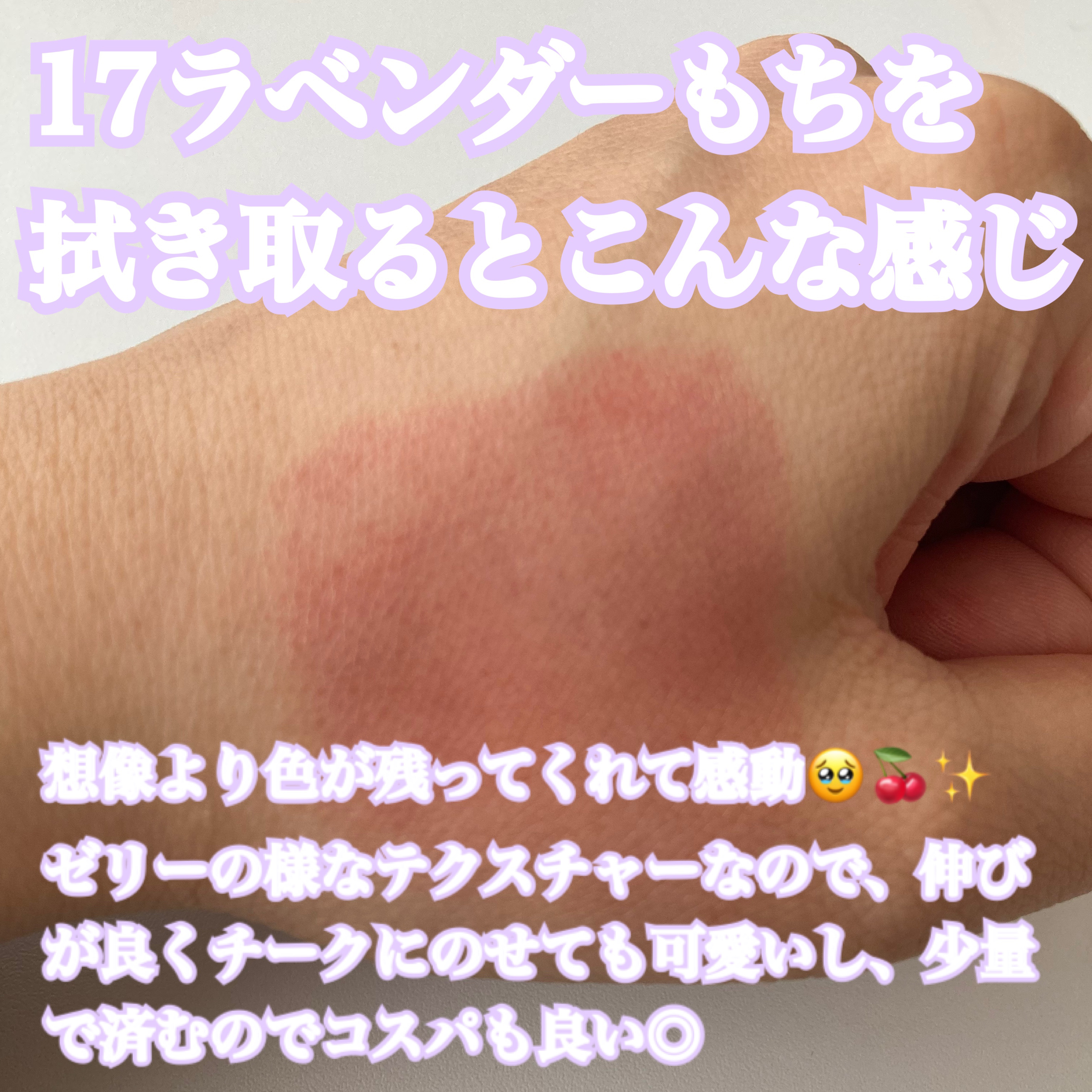 - <01 パパイヤクリーム> 水、ヘキサ(ヒドロキシステアリン酸/ステアリン酸/ロジン酸)ジペンタエリスリチル、トリエチルヘキサノイン、BG、グリセリン、オクチルドデカノール、ポリソルベート60、プロパンジオール、(PEG-240/デシルテトラデセス-20/HDI)コポリマー、1,2-ヘキサンジオール、セテアレス-20、フェノキシエタノール、エチルセルロース、カプリル酸グリセリル、(アクリル酸ヒドロキシエチル/アクリロイルジメチルタウリンNa)コポリマー、トリイソステアリン酸ポリグリセリル-2、リンゴ酸ジイソステアリル、酸化チタン、スクワラン、(アクリレーツ/アクリル酸アルキル(C10-30))クロスポリマー、トロメタミン、香料、エチルヘキシルグリセリン、黄4、赤104(1)、黄5、赤227、エチレンジアミンジコハク酸3Na、イソステアリン酸ソルビタン、ジイソステアリン酸ポリグリセリル-2、リナロール、ラウリン酸K、トコフェロール、青1 <02 ピーチドロップ> 水、ヘキサ(ヒドロキシステアリン酸/ステアリン酸/ロジン酸)ジペンタエリスリチル、トリエチルヘキサノイン、BG、グリセリン、オクチルドデカノール、ポリソルベート60、プロパンジオール、(PEG-240/デシルテトラデセス-20/HDI)コポリマー、1,2-ヘキサンジオール、セテアレス-20、フェノキシエタノール、リンゴ酸ジイソステアリル、酸化チタン、エチルセルロース、カプリル酸グリセリル、(アクリル酸ヒドロキシエチル/アクリロイルジメチルタウリンNa)コポリマー、トリイソステアリン酸ポリグリセリル-2、スクワラン、(アクリレーツ/アクリル酸アルキル(C10-30))クロスポリマー、トロメタミン、香料、エチルヘキシルグリセリン、黄5、赤104(1)、赤227、黄4、エチレンジアミンジコハク酸3Na、イソステアリン酸ソルビタン、ジイソステアリン酸ポリグリセリル-2、青1、リナロール、ラウリン酸K、トコフェロール <03 ハニーマンゴ> 水、ヘキサ(ヒドロキシステアリン酸/ステアリン酸/ロジン酸)ジペンタエリスリチル、トリエチルヘキサノイン、BG、グリセリン、オクチドデカノール、ポリソルベート60、プロパンジオール、(PEG-240/デシルテトラデセス-20/HDI)コポリマー、1,2-ヘキサンジオール、セテアレス-20、フェノキシエタノール、エチルセルロース、リンゴ酸ジイソステアリル、カプリル酸グリセリル、酸化チタン、(アクリル酸ヒドロキシエチル/アクリロイルジメチルタウリンNa)コポリマー、トリイソステアリン酸ポリグリセリル-2、スクワラン、(アクリレーツ/アクリル酸アルキル(C10-30))クロスポリマー、トロメタミン、香料、エチルヘキシルグリセリン、赤104(1)、黄5、赤227、黄4、エチレンジアミンジコハク酸3Na、イソステアリン酸ソルビタン、ジイソステアリン酸ポリグリセリル-2、リナロール、ラウリン酸K、トコフェロール、青1 <04 ピンクバブル> 水、ヘキサ(ヒドロキシステアリン酸/ステアリン酸/ロジン酸)ジペンタエリスリチル、トリエチルヘキサノイン、BG、グリセリン、オクチドデカノール、ポリソルベート60、プロパンジオール、(PEG-240/デシルテトラデセス-20/HDI)コポリマー、1,2-ヘキサンジオール、セテアレス-20、フェノキシエタノール、エチルセルロース、カプリル酸グリセリル、トリイソステアリン酸ポリグリセリル-2、(アクリル酸ヒドロキシエチル/アクリロイルジメチルタウリンNa)コポリマー、スクワラン、(アクリレーツ/アクリル酸アルキル(C10-30))クロスポリマー、リンゴ酸ジイソステアリル、酸化チタン、トロメタミン、香料、エチルヘキシルグリセリン、赤104(1)、酸化鉄、赤227、エチレンジアミンジコハク酸3Na、ジイソステアリン酸ポリグリセリル-2、黄4、イソステアリン酸ソルビタン、黄5、リナロール、ラウリン酸K、トコフェロール <05 アップルゼリー> 水、ヘキサ(ヒドロキシステアリン酸/ステアリン酸/ロジン酸)ジペンタエリスリチル、トリエチルヘキサノイン、BG、グリセリン、オクチドデカノール、ポリソルベート60、プロパンジオール、(PEG-240/デシルテトラデセス-20/HDI)コポリマー、1,2-ヘキサンジオール、セテアレス-20、フェノキシエタノール、トリイソステアリン酸ポリグリセリル-2、エチルセルロース、カプリル酸グリセリル、(アクリル酸ヒドロキシエチル/アクリロイルジメチルタウリンNa)コポリマー、スクワラン、(アクリレーツ/アクリル酸アルキル(C10-30))クロスポリマー、トロメタミン、香料、リンゴ酸ジイソステアリル、酸化チタン、エチルヘキシルグリセリン、赤227、黄5、赤104(1)、黄4、エチレンジアミンジコハク酸3Na、ジイソステアリン酸ポリグリセリル-2、イソステアリン酸ソルビタン、リナロール、ラウリン酸K、トコフェロール、青1 <06 クアバキャンディ> 水、ヘキサ(ヒドロキシステアリン酸/ステアリン酸/ロジン酸)ジペンタエリスリチル、トリエチルヘキサノイン、BG、グリセリン、オクチドデカノール、ポリソルベート60、プロパンジオール、(PEG-240/デシルテトラデセス-20/HDI)コポリマー、1,2-ヘキサンジオール、セテアレス-20、フェノ