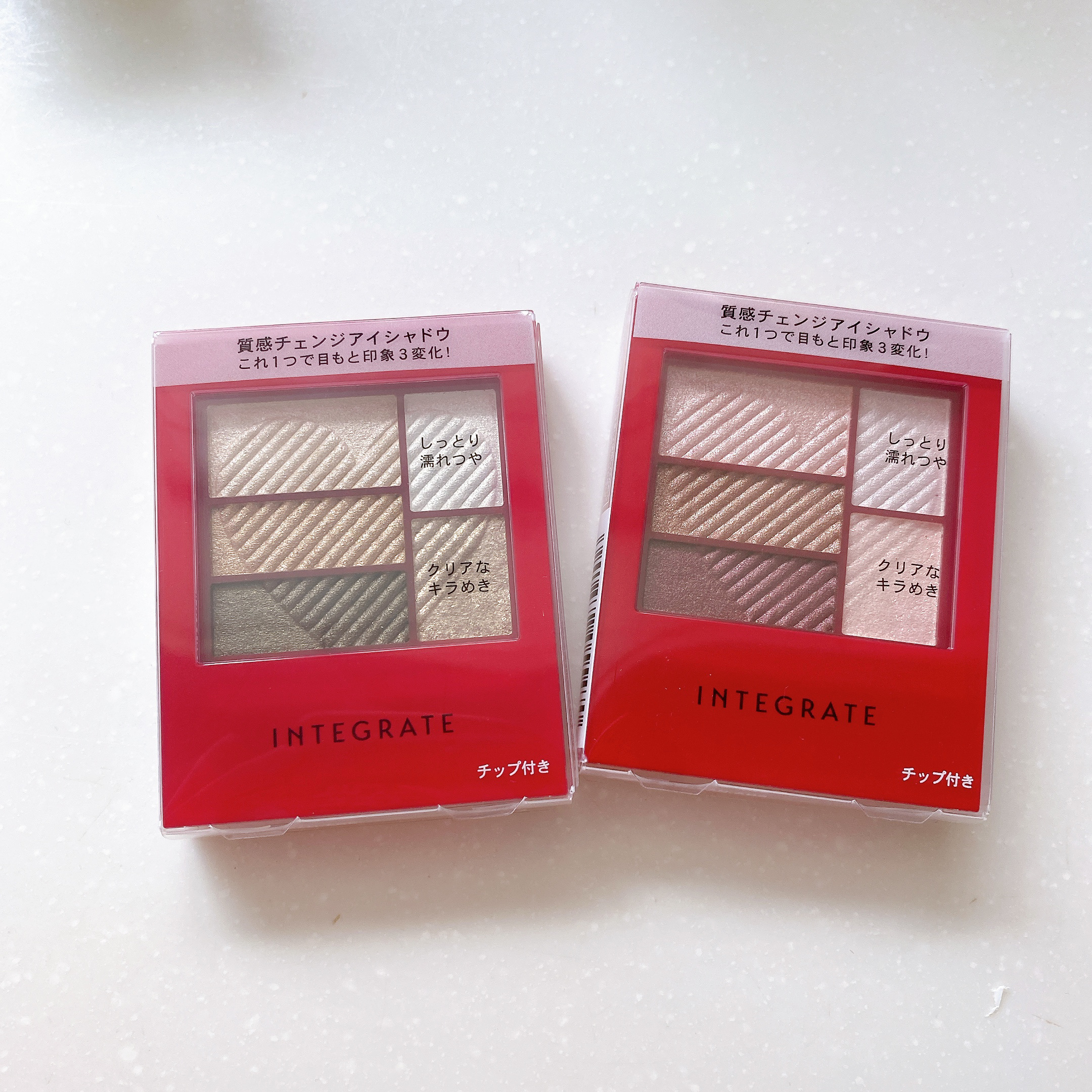 💕INTEGRATEトリプルレシピアイズ💰¥1500(税抜)🎨RD516ベルベットピーチ(限定)🎨PK517ダスティーローズ(限定)[質感チェンジアイシャドウ✨]これ1つで目もと印象3変化!☑基本のグラデーション①ハイライトカラー②ミディアム...