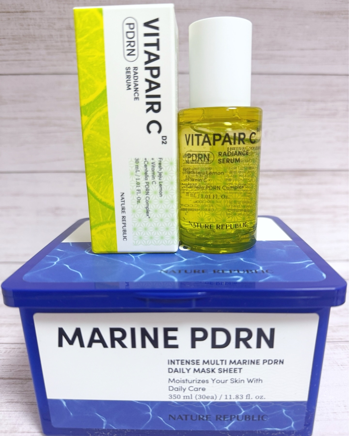 ネイチャーリパブリックPDRNデイリーシートマスク MARINEPDRN前回投稿したビタペアCPDRN水潤セラムはこのデイリーシートマスクを一緒に使用すること効果的なんだって♡エッセンスたっぷりでひったひた!うすいマスクだけどみずみずしくてひ...