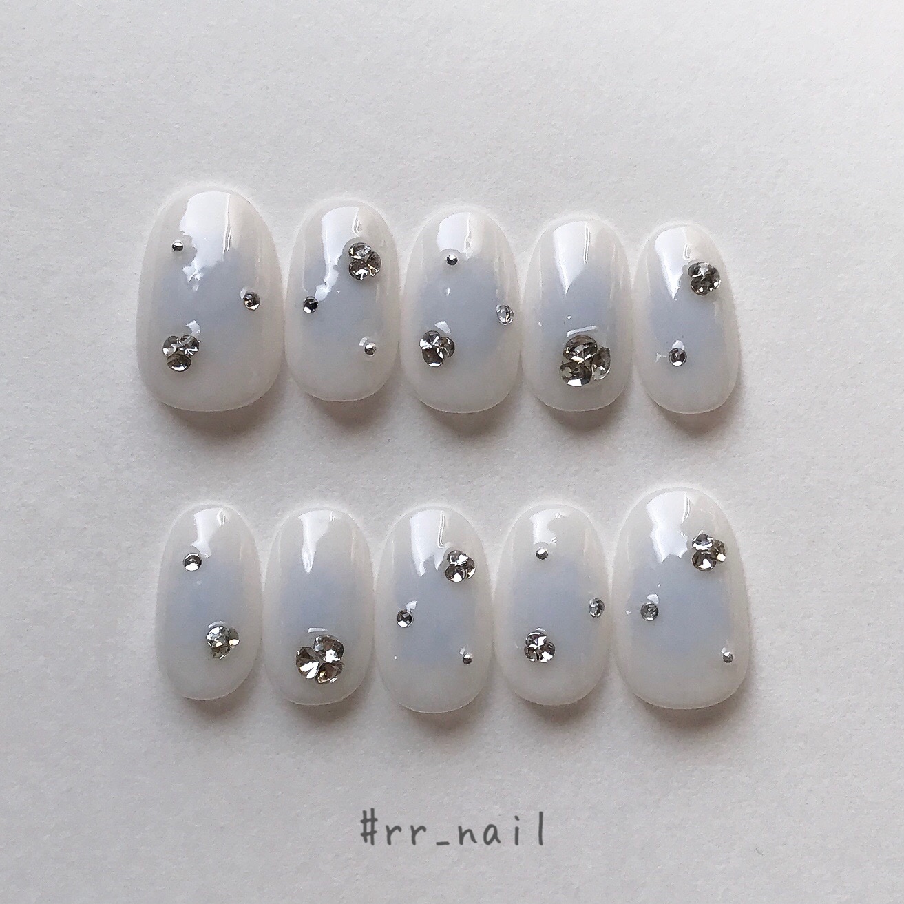 見る角度によってラメ感が変わるのでマグネットジェルおすすめです◎ ミルクホワイトが思ってたより黄味が強くて上からピンクベージュを重ねちゃいました! ストーンをつけるとこで華やかさをプラス◎ ラメを斜めに集めたので輝きが