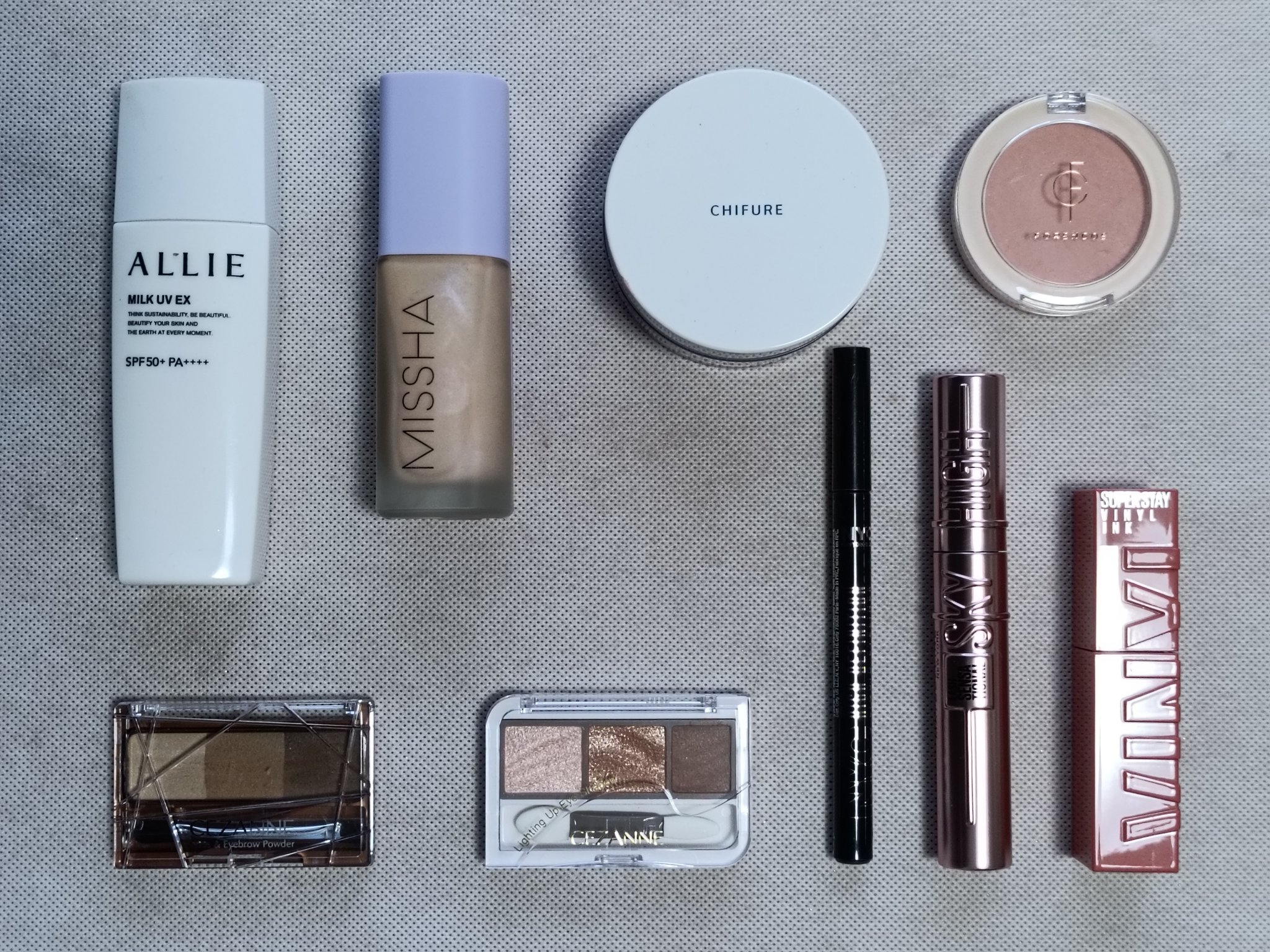 アリィー ニュアンスチェンジUV ジェル RSを、顔全体にまんべんなく塗ります。 RMK RMK ジェルクリーミィファンデーション 103を、顔全体にまんべんなく塗ります。 ジョンソンベビー ジョンソン ベビーパウダーを、顔全体にまんべんなく軽くはたきます。 THE BODY SHOP bronze shade warm glowを、両頬に塗ります。 KATE リフレクトミラーアイズ BR-1の締め色を、眉毛全体にまんべんなく塗ります。 URGLAM UR GLAMBLOOMING EYE COLOR PALETTE 01を、使用しました。 ちふれ リキッド アイライナー 筆ペンタイプ BK30 ブラックを、塗ります。 CEZANNE エアリーカールマスカラを、まつ毛全体にまんべんなく塗ります。 MAYBELLINE NEW YORK コロッサルボリュームエクスプレスを、まつ毛全体にまんべんなく塗ります。 MAYBELLINE NEW YORK SPステイ マットインク 135を、唇全体にまんべんなく塗ります。