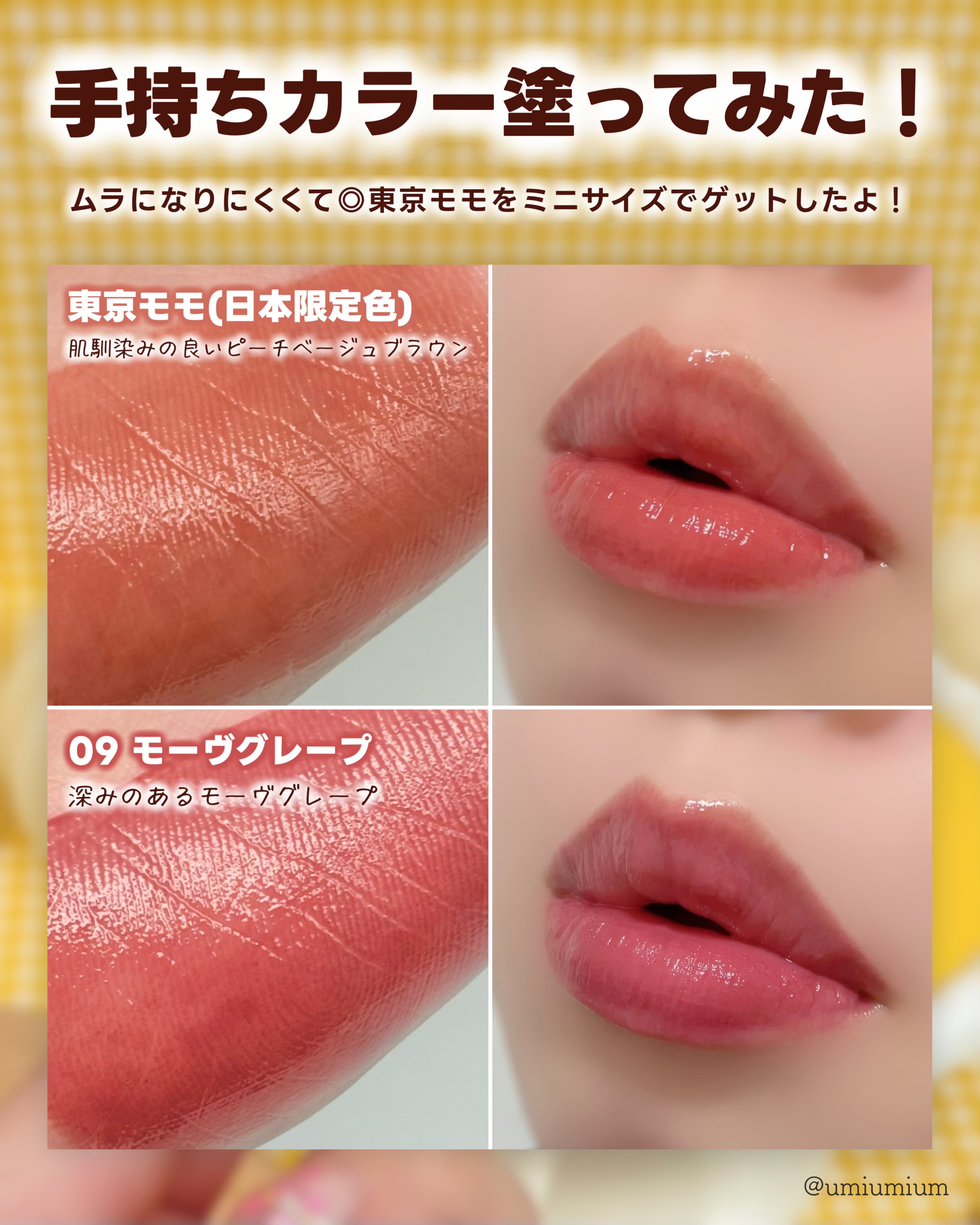 - <01 ラヴィアンコーラル> 精製水、ジフェニルジメチコン、リンゴ酸ジイソステアリル、ビスジグリセリルポリアシルアジペート-2、水添ポリイソブテン、ジグリセリン、セチルPEG/PPG-10/1ダイメチコン、DPG、イソステアリン酸ソルビタン、ポリソルベート60、オクチルドデカノール、ペンチレングリコール、グリセリン、二酸化チタン、セテアレス-20、アクリル酸ヒドロキシエチル/ナトリウムアクリロイルジメチルタウリン酸共重合体フェノキシエタノール、スクアラン、ポリグリセリン-3、香料、ステビオシド、黄色4号、エチルヘキシルグリセリン、赤色227号、トリ(カプリル/カプリン酸)グリセリル、赤色104号(1)、トコフェリルアセテート、黄色5 号、ブリリアントブルーFCF、マンゴー果実エキス、リンゴエキス <06 フィグデュー> 水、ジフェニルジメチコン、リンゴ酸ジイソステアリル、ポリアシルアジピン酸ビス-ジグリセリル-2、水添ポリイソブテン、ジグリセリン、セチルPEG/PPG-10/1ジメチコン、ジプロピレングリコール、イソステアリン酸ソルビタン、ポリソルベート60、オクチルドデカノール、ペンチレングリコール、グリセリン、二酸化チタン(CI) 77891)、セテアレス-20、アクリル酸ヒドロキシエチル/アクリロイルジメチルタウリンナトリウムコポリマー、スクワラン、フェノキシエタノール、ポリグリセリン-3、香料、ステビオシド、赤28(CI 45410)、黄6(CI 15985)、黄5(CI 19140)、エチルヘキシルグリセリン、レッド 33 (CI 17200)、カプリル酸/カプリン酸トリグリセリド、酢酸トコフェロール、ブルー 1 (CI 42090)、Mangifera Indica (マンゴー) 果実エキス、Pyrus Malus (リンゴ) 果実エキス <12 日曜日> 水、ジフェニルジメチコン、リンゴ酸ジイソステアリル、ビスジグリセリルポリアシルアジペート-2、水添ポリイソブテン、ジグリセリン、セチルPEG/PPG-10/1ジメチコン、DPG、イソステアリン酸ソルビタン、ポリソルベート60、オクチルドデカノール、ペンチレングリコール、グリセリン、セテアレス-20、(アクリル酸ヒドロキシエチル/アクリロイルジメチルタウリンNa)コポリマー、フェノキシエタノール、スクワラン、ポリグリセリン-3、ステビオシド、香料、エチルヘキシルグリセリン、トリ(カプリル酸/カプリン酸)グリセリル、酢酸トコフェロール、マンゴー果実エキス、リンゴ果実エキス、酸化チタン、酸化鉄、黄4、赤227、赤104(1)、黄5、青1 <【旧】02 漢江ブリーズ> 水、ジフェニルジメチコン、リンゴ酸ジイソステアリル、ポリアシルアジピン酸ビス-ジグリセリル-2、水添ポリイソブテン、ジグリセリン、セチルPEG/PPG-10/1ジメチコン、ジプロピレングリコール、イソステアリン酸ソルビタン、ポリソルベート60、オクチルドデカノール、ペンチレングリコール、グリセリン、二酸化チタン(CI) 77891)、セテアレス-20、アクリル酸ヒドロキシエチル/アクリロイルジメチルタウリンナトリウムコポリマー、フェノキシエタノール、スクワラン、イエロー6 (CI 15985)、ポリグリセリン-3、香料、ステビオシド、エチルヘキシルグリセリン、レッド33 (CI 17200)、レッド28 (CI 45410)、トリカプリル/カプリン酸グリセリド、酢酸トコフェロール、ブルー 1 (CI 42090)、Mangifera Indica (マンゴー) 果実エキス、Pyrus Malus (リンゴ) 果実エキス <【旧】05 ヒップジロー> 水、ジフェニルジメチコン、リンゴ酸ジイソステアリル、ポリアシルアジピン酸ビス-ジグリセリル-2、水添ポリイソブテン、ジグリセリン、セチルPEG/PPG-10/1ジメチコン、ジプロピレングリコール、イソステアリン酸ソルビタン、ポリソルベート60、オクチルドデカノール、ペンチレングリコール、グリセリン、二酸化チタン(CI) 77891)、セテアレス-20、アクリル酸ヒドロキシエチル/アクリロイルジメチルタウリンナトリウムコポリマー、スクワラン、フェノキシエタノール、イエロー6 (CI 15985)、ポリグリセリン-3、香料、ステビオシド、エチルヘキシルグリセリン、レッド33 (CI 17200)、カプリル酸/カプリン酸トリグリセリド、酢酸トコフェロール、ブルー 1 (CI 42090)、Mangifera Indica (マンゴー) 果実エキス、Pyrus Malus (リンゴ) 果実エキス <【旧】09 ソウル ソウル> 水、ジフェニルジメチコン、マレートジソステアル、ビスジグリセリルポリシルダイピン-2、水素化ポリイソブテン、ディグリセリン、セチルペグ/PPG-10/1ジメチコン、ジップロピレングリコール、ソルビトン等酸塩、ポリソルベ酸60、オクティロドデドカン、ペンシェルン、ペントリン酸塩、ペントリ酸塩、ペンシュレン 二酸化チタン (CI 77891)、アクリル酸ヒドロキシエチル/アクリロイルジメチルタウリン酸ナトリウムコポリマー、フェノキシエタノール、スクワラン、イエロー6 (CI 15985)、ポリグリセリン-3、香料、ステビオシド、エチルヘキシルグリセリン、レッド33 (CI 17200)、カプリル酸/カプリン酸トリグリセリド、酢酸トコフェロール、ブルー 1 (CI 42090)、Mangifera Indica (マンゴー) 果実エキス、Pyrus Malus (リンゴ) 果実エキス <【旧】10 朝イチジク> 水、ジフェニルジメ