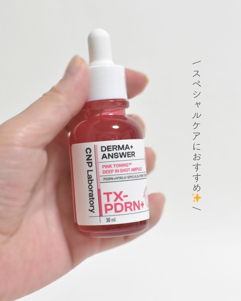 CNPのピンクトーニング™ディープインショットアンプル PDRN・トラネキサム酸・ピンクビタミン・ナイアシンアミドの組み合わせでくすんだ毛穴を明るく照らしてくれるピンクライト針美容液 CNP独自の研究者が開発した毛穴より小さい「ヒアルスピキュール」で保湿ケアも! 個人的な感想としては、私は痛みにすごく弱いですが針美容液の中では針感は少ないほうに感じました。