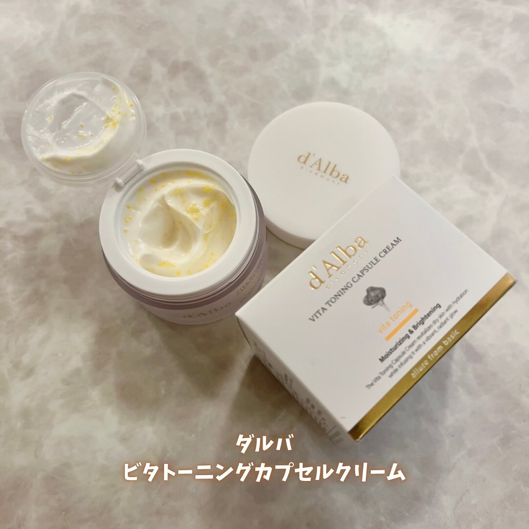 d'Alba(ダルバ)#ビタトーニングカプセルクリームとろけるようなテクスチャーのクリームの中に、黄色い保湿光彩オイルカプセルが入っています。無膜カプセルなので粒々感はを感じず、クリームと一緒になって肌にスーッとなじみます。肌になじませるとベ...