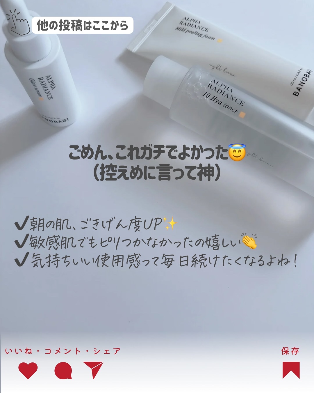 バノバギ.ᐟアルファラディアンスシリーズ🙌ˎˊ˗アルファ×アルブチン×氷河水配合で保湿と美白の両方をサポート💕敏感肌にも使いやすく肌に優しい処方✨アルファラディアンス セラムとろとろで伸びはよく潤いを感じるテク...
