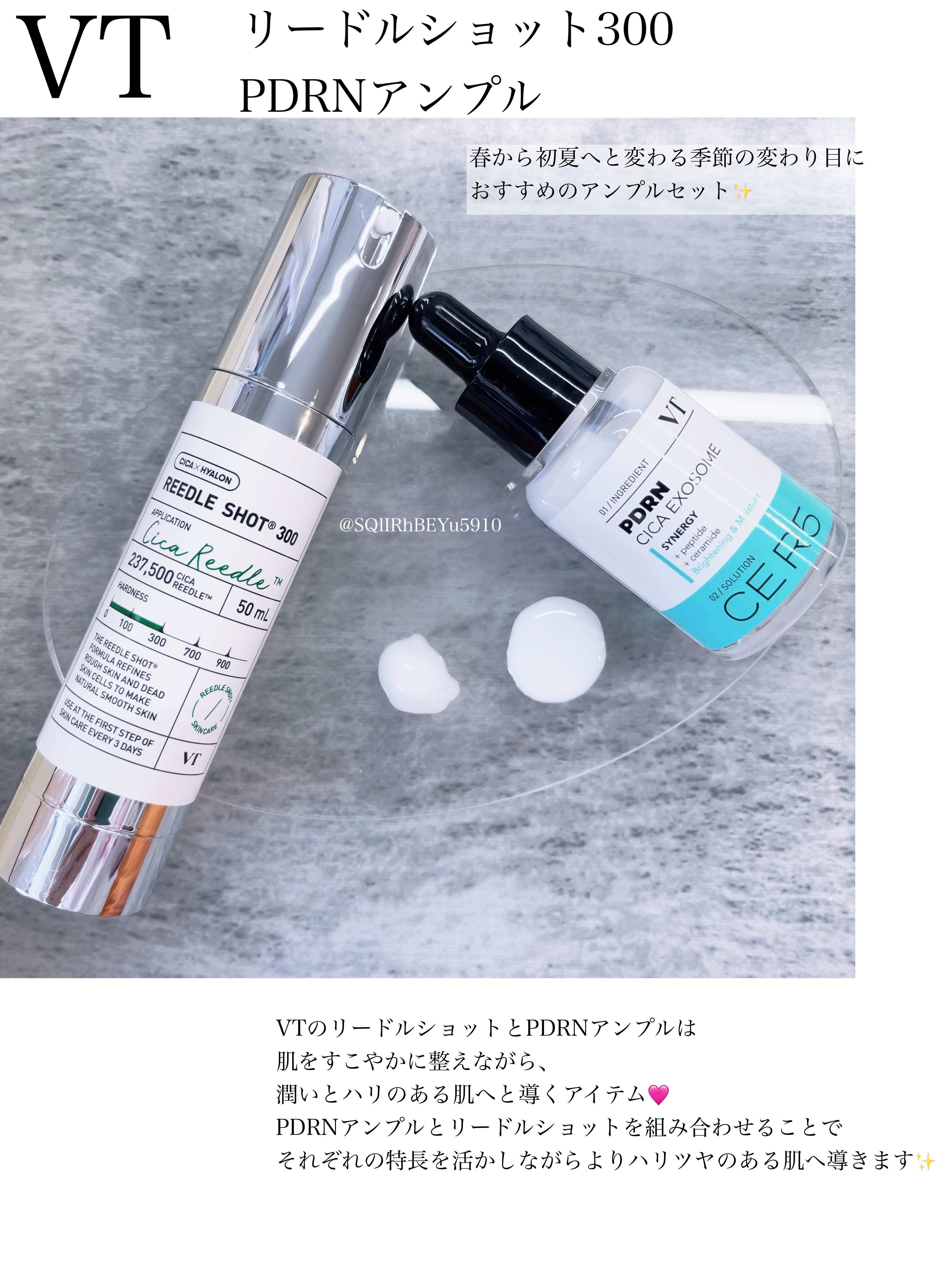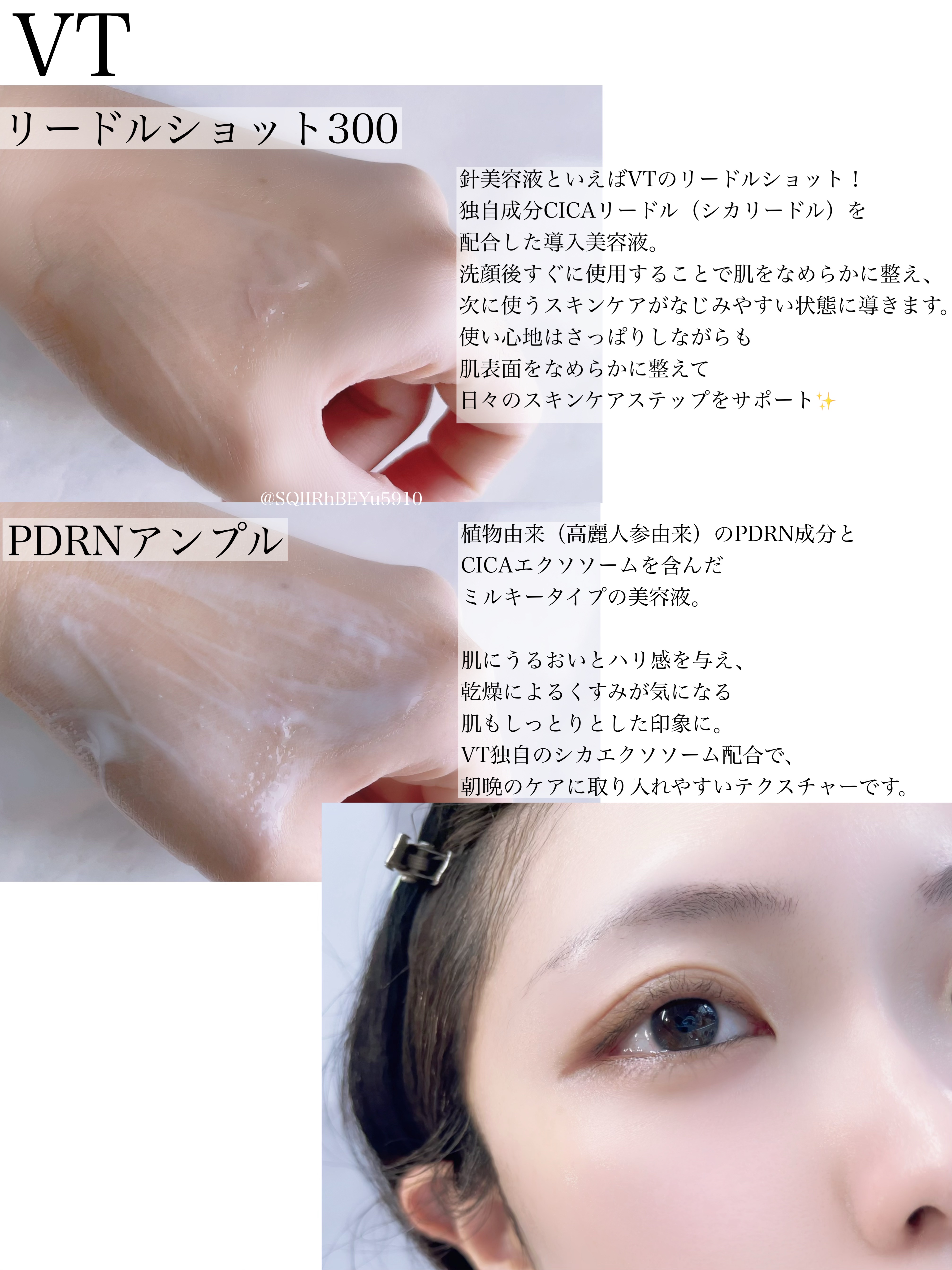 ▶︎VT#PRVTの中でもお気に入りのツヤ肌メイカーコンビをご紹介🌿✴︎リードルショット300リードルショットはもはや説明不要?なVTの看板針美容液🪡だよね。独自成分のCICAニードルで洗顔後すぐの使用で、肌を整えてくれるよ✨300は100よ...