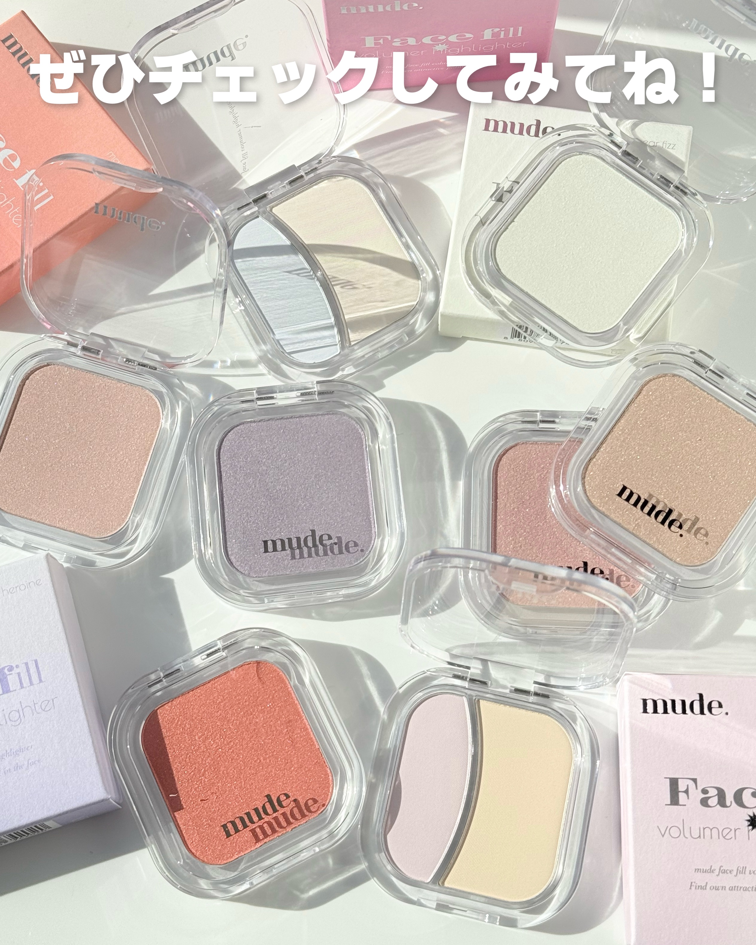【新作ハイライターが可愛い💫】mudeから5月1日より発売のフェイスフィルボリューマーハイライター8色展開でパール6色(そのうち2色は5/31発売)・マット2色P01disco 華やかなピンクビーム。P02prismdew ナチュラルな輝き。...