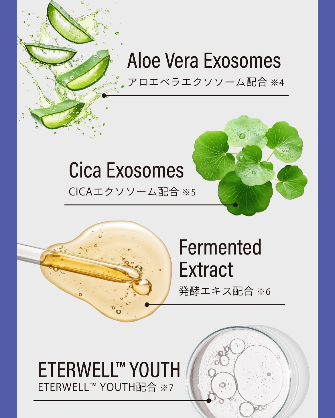 - 【全成分】水、 メチルプロパンジオール、DPG、グリセリン、1,2-ヘキサンジオール、DNA-Na、セラミドNP、セラミドNG、セラミドNS、セラミドA P、セラミドAS、セラミドEOP、 エピロビウムフレイスケリ葉/茎エキス、アロエベラエキス、ツボクサ葉小胞、 乳酸球菌培養溶解質、 ビフィズス菌 培養溶解質、乳酸桿菌培養溶解質、ニコチンアミドモノヌクレオチド、ガラクトミセス培養液、ナイアシンアミド、シア脂、サリチロイルフィトスフィ ンゴシン、テトラアセチルフィトスフィンゴシン、フィトスフィンゴシン、オリーブ果実油、スクワラン、ヒアルロン酸Na、水添レシチン、レシチン、アルギ ニン、スフィンガニン、トリ(カプリル酸/カプリン酸)グリセリル、コレステロール、ベタイン、ベルガモット果実油、ヤシ油脂肪酸ポリグリセリルー3、 コハク酸ジエトキシエチル、BG、(C12-14) アルケス 12、カルボマー、キサンタンガム、 EDTA-2Na、クエン酸※1DNA-Na(保湿成分) 2セラミドNP、セラミドNG、セラミドNS、セラミドAP、セラミドAS、セラミドEOP (全て保湿成分) ※3アロエベラエキス (保湿成分)4ツボクサ葉小胞 (保湿成分) ※5乳酸球菌培養溶解質、 ビフィズス菌培養溶解質、乳酸桿菌培養溶解質(全て保湿成分) ※6エ ピロビウムフレイスケリ葉/茎エキス、グリセリン、水、 クエン酸 (全て保湿成分)ETERWELL TM はdsm-firmenichグループの商標です。