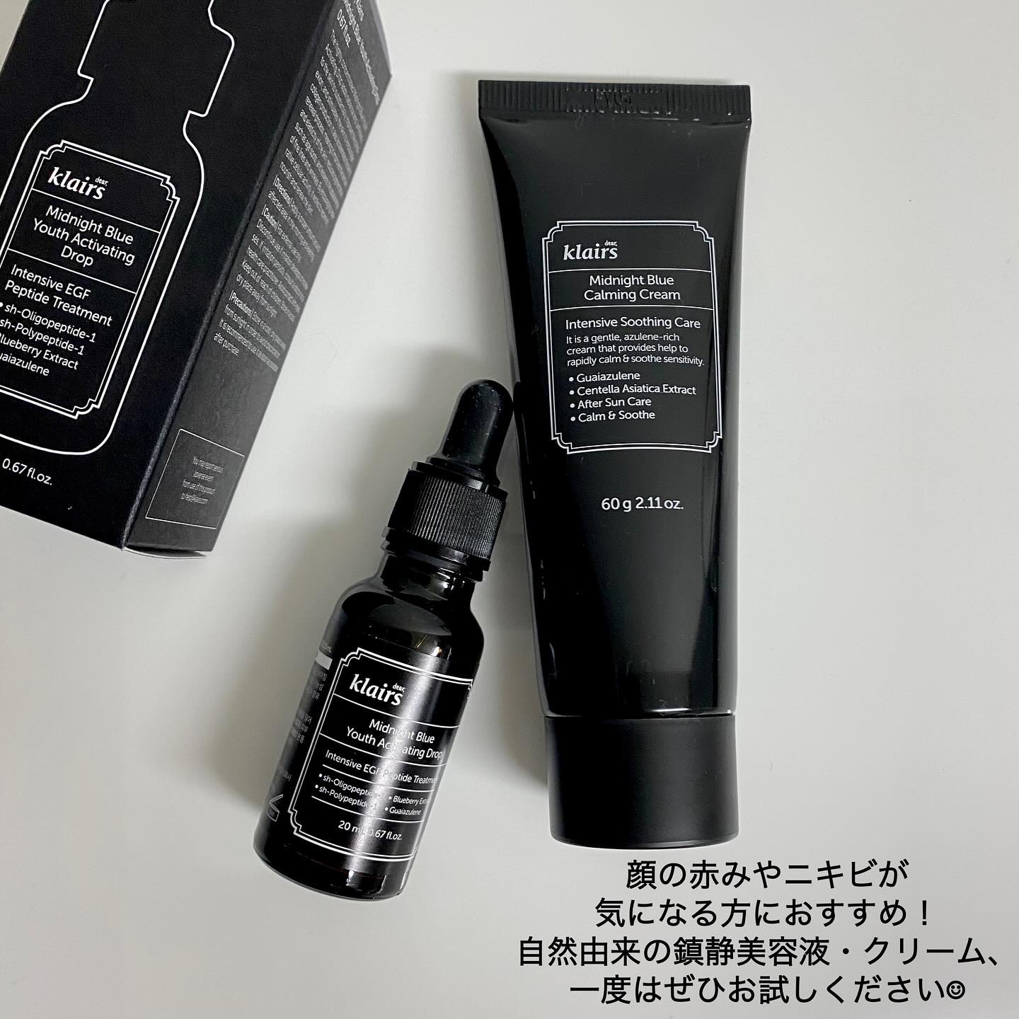 ⭐︎⭐︎⭐︎⭐︎⭐︎klairsミッドナイトブルードロップミッドナイトブルーカーミングクリーム肌荒れを改善してくれる青い美容液とクリーム。青さの理由は、着色料ではなく、グアイアズレン!炎症を抑える医薬品にも使われている注目度が高い成分!・ミッ...
