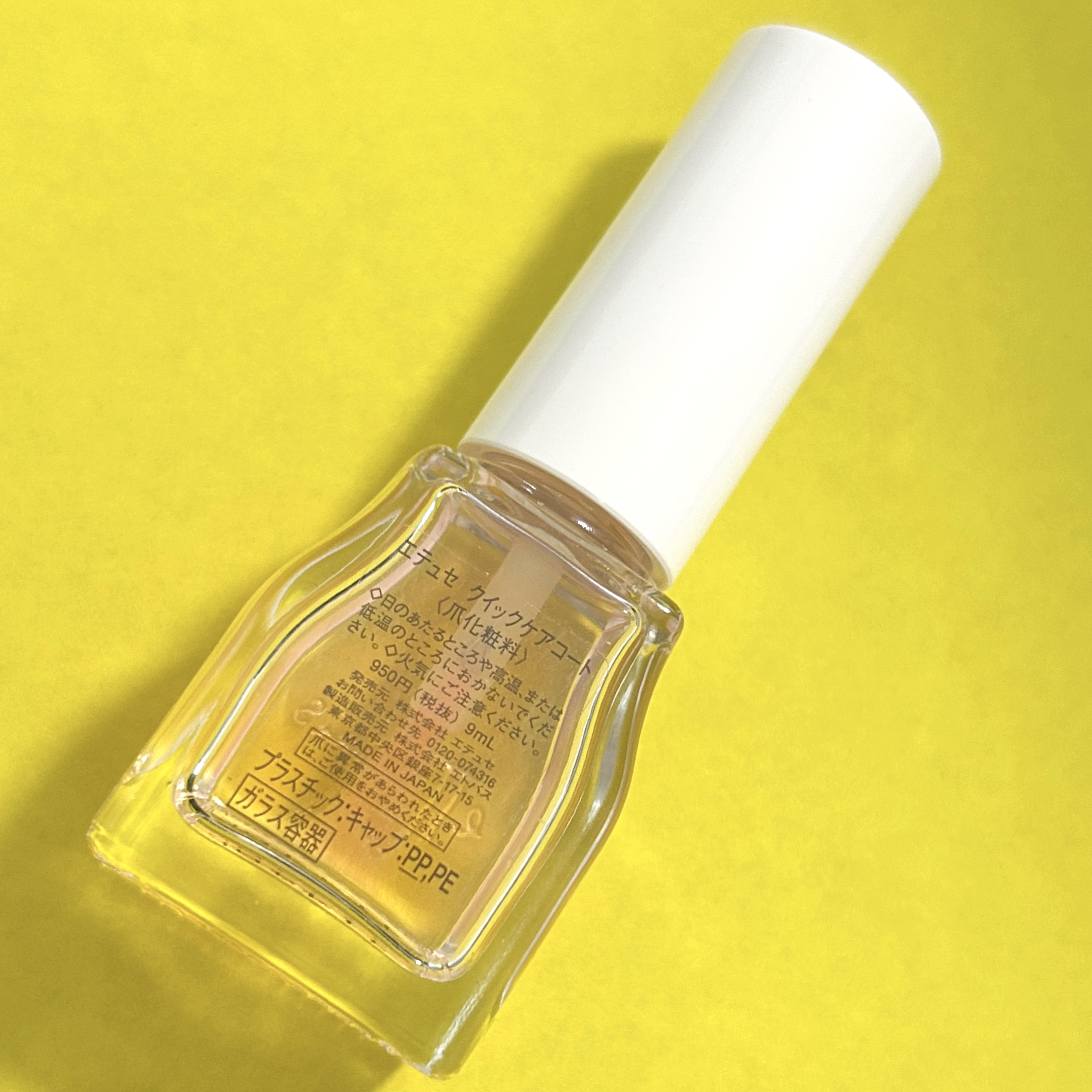 - 素爪でいるより、爪にいい。速乾!リムーバーいらず!透明薄膜ヴェールで爪を保護&ケアする、ツヤ出しネール用美容液。 弱い爪を摩擦や乾燥から保護し、爪のカケ・割れ・二枚爪・乾燥を防ぎます。 塗布すると、エッセンスコート成分が均一な薄膜をつくり、ナチュラル光沢成分&植物オイル(*)が自然なツヤを与えます。 ほんのりピンク色で、爪磨きしたようなナチュラルなツヤ仕上げです。 トルエンフリー、無香料で爪へのやさしさを配慮。 通常のトップコートやハードナーは、一部はがれると、厚みがあるため、凹凸になりますが、「クイックケアコート」は、厚みのない薄膜仕上げなので、落とさず、上から塗布してもキレイになじむので、リムーバーいらずです。 *ホホバ油・ローズヒップ油・マカデミアナッツ油 <こんな時におすすめ> ・爪を保護しながらツヤも出るので、マニキュアをお休みしたい時に ・超速乾だからササッと簡単にケアしたい時に ・ナチュラルなツヤ、仕事上ネールNGでもキレイに見せたい時に 【価格改定について】 いつもご愛用いただきありがとうございます。 この度、原材料高騰などにより、2025年9月1日より、希望小売価格の変更を行うこととなりました。 何卒ご理解を賜わりますよう、心よりお願い申し上げます。 エテュセ クイックケアコート 旧価格 税込1,045円(税抜950円) ↓ 新価格 税込1,265円(税抜1,150円)