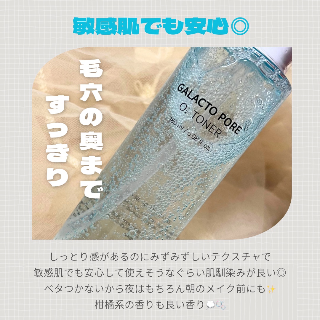 - ガラクトシリーズより新しく登場したガラクトポアオーツー(O2)トナー。 新感覚の酸素を含んだバブルエッセンスが毛穴に詰まった古い角質や過剰な皮脂をケアして肌のキメを整え、イキイキとした肌印象に導きます。 敏感なお肌にもやさしい使い心地で毛穴ケアが可能です。 しっとりべたつきのないテクスチャーで朝晩使用でき、さらに乾燥による毛穴目立ちを防ぐため肌表面に潤いを与えます。 皮膚低刺激テスト完了済*。敏感肌の方もご使用いただけます。 <特長成分> ガラクトミセス発酵ろ過物 : 肌にやさしい使い心地でうるおいを与える。(保湿成分) ウィッチヘーゼル : 肌を引き締めなめらかな印象をサポート。(整肌成分) PHA : 角質ケア成分配合。(角質柔軟成分) <テクスチャー&香り> - テクスチャー しっとり伸びやすく肌になじみやすいテクスチャー - 香り シトラスハーブ系 *全ての方に皮膚刺激が発生しないということではありません