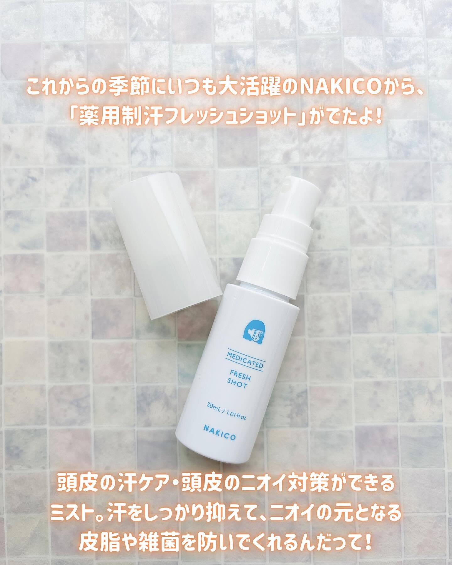 - 【医薬部外品】 日常の生活シーンでの気になる頭まわりのニオイや汗問題に着目。NAKICOの新作「薬用制汗フレッシュショット」はフェノールスルホン酸亜鉛とイソプロピルメチルフェノールのW主剤*配合の制汗ミストです。直接肌に届きやすいダイレクトノズル採用で使いやすい設計。メントール配合で清涼感もプラス。フレッシュグレープフルーツの爽やかな香り。 有効成分:フェノールスルホン酸亜鉛、シメン-5-オール