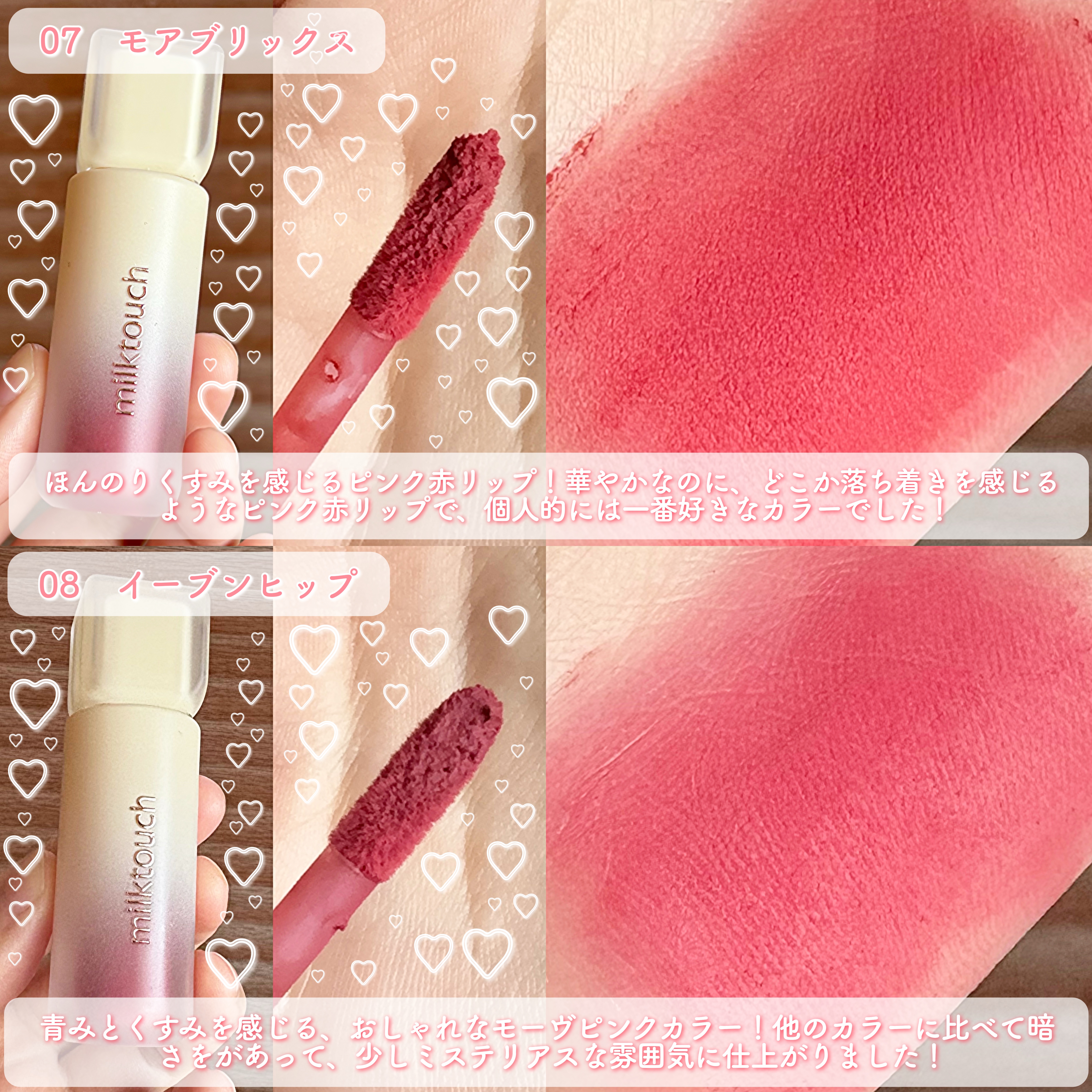 milktouch(ミルクタッチ)から新作マットティントが登場🩷まるでクリームチーズのような濃密でなめらかなテクスチャーが唇にぴたっと密着。自然な発色と軽やかなマット質感で、まるでヨーロッパで人気の桃“ドーナツピーチ”のようなふわっとしたボリ...
