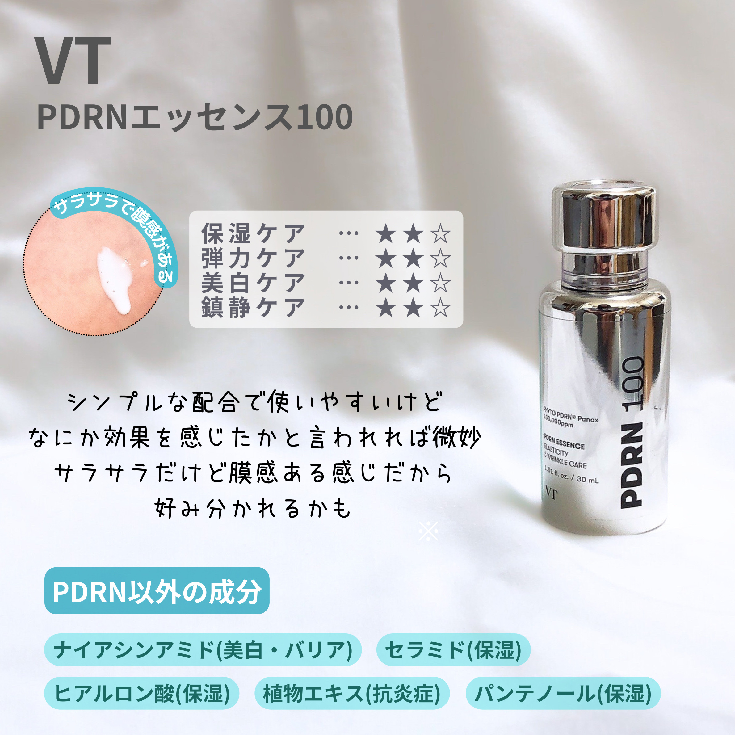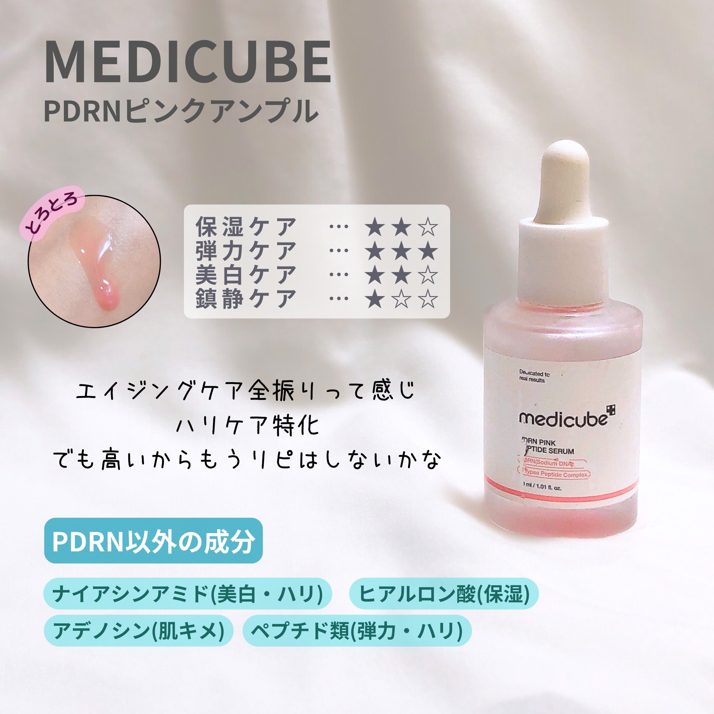 PDRN10.000ppm高濃度配合 サーモン由来の動物性PDRNが肌の再生力をサポート✨ ピンクのとろっとしたテクスチャーで、伸びが良く肌にスッと馴染む感じが心地良い♡ 使ってみると、翌朝肌がぷるんと弾むようなハリ感を感じました✨