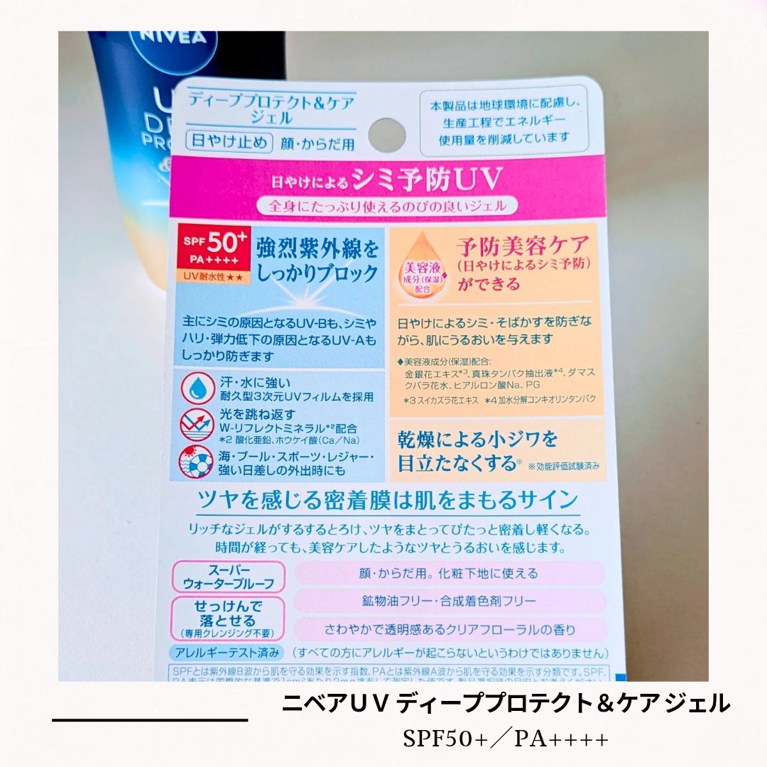 ニベアUVディーププロテクト&ケアジェル新日やけによるシミ予防*1UV全身にたっぷり使えるのびの良いジェル*1日やけによるシミ・そばかすを防ぐSPF50+/PA++++✼••┈┈••✼••┈┈••✼••┈┈••✼••┈┈••✼せっけんで落とせ...