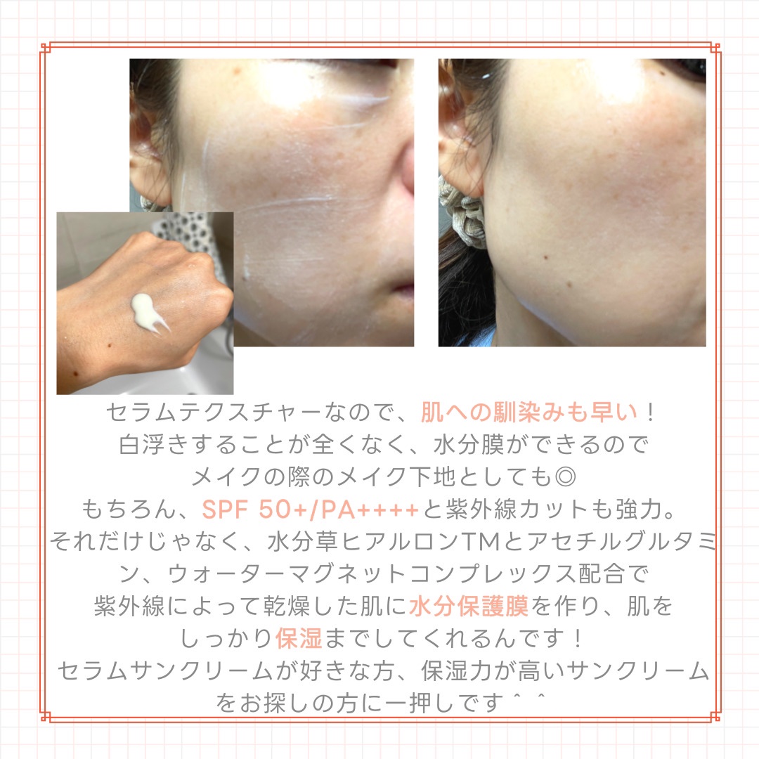 | 日焼け止め・UVケアランキング第10位 | ふわっとした硬めのクリームだけど、 するっと伸びが良く、 なじませているうちに水感を感じ、 なじむとベタつきなく さらっと軽い使い心地だよ。 | 詳細を見る | |