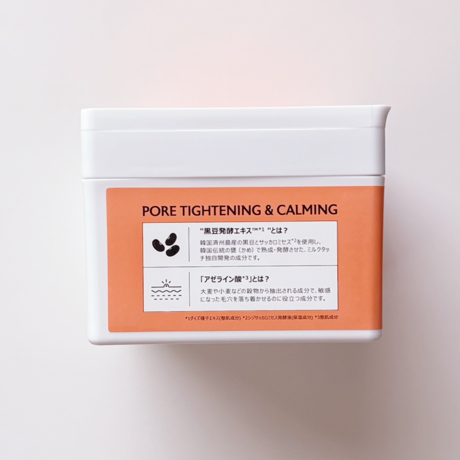 - 【日本限定】 1:“皮脂ケア成分”として注目のアゼライン酸*1が繰り返す毛穴悩みにアプローチ アゼライン酸*1は、皮脂による肌のベタつきを防ぐサポートや肌のなめらかさをサポート、肌荒れ予防などに働きかける話題の成分。 皮脂の過剰分泌による毛穴目立ちにアプローチして、毎日のケアでなめらかな肌印象に導きます。 ミルクタッチは、デイリーマスクにたっぷりとアゼライン酸を配合し、毛穴の目立ちにくいイキイキとした肌印象に近づけます。 2:韓国伝統の甕器(かめき)発酵で「黒い宝石」と呼ばれる黒豆を発酵 韓国のチェジュ島は自然豊かな火山島。 ミネラルなどの栄養分をたっぷりと含んだ土壌で育った黒豆は「黒い宝石」と呼ばれています。 黒豆と発酵酵母を持つサッカロミセス*4で発酵させて生み出された黒豆発酵エキス*2は、肌にふっくらとしたうるおいを与えて、乾燥による毛穴目立ちをケアします。 3:ナイアシンアミド*1が毛穴ケア*3も潤いに満ちた透明感も、乾燥によるあらゆる肌悩みに 肌荒れの予防や乾燥くすみのケア、バリア機能のサポート、肌にハリを与えるサポートなど美容成分界のマルチプレイヤー、ナイアシンアミド*1も配合。毛穴目立ち*3のほかさまざまな乾燥による肌悩みに働きかけ美肌をサポートします。 4:低刺激処方*5&こだわりの純テンセルシートを採用 毎日使っていただきたく、低刺激処方*5に。 また、エッセンスをたっぷり含有する吸収性の高いユーカリ木由来の純テンセルシートを採用。 肌当たりがなめらかで、肌に優しい使い心地が特徴です。 *1整肌成分 *2ダイズ種子エキス(整肌成分) *3乾燥による *4シゾサッカロミセス発酵液(整肌成分) *5すべての人に皮ふ刺激が起きないわけではありません