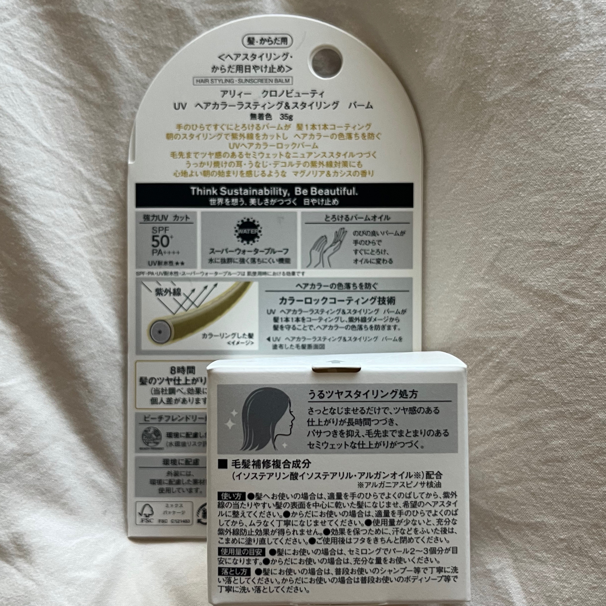 •*¨*•.¸¸☆アリィーから紫外線によるヘアカラーの色落ちを防ぐ万能スタイリングバームが発売されたので使ってみました•*¨*•.¸¸☆髪に使えるUVスプレーはあったけど、スタイリングバームは無かったですよねアリィークロノビューティUVヘアカ...