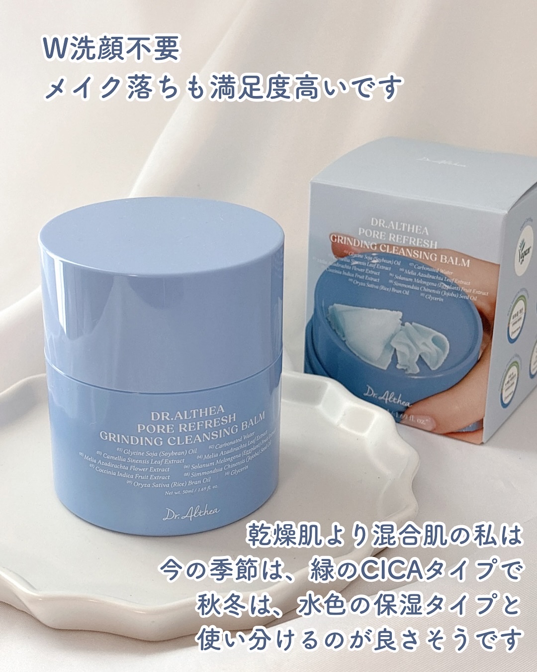 Dr.Altheaのシャーベットクレンジングバームに保湿タイプ出たよ🩵Dr.Althea(ドクターエルシア)『ポアリフレッシュグラインディングクレンジングバーム』ホホバオイル、グアイアズレン、緑茶エキスなどが肌を保湿しながらハリ弾力ケアできる...