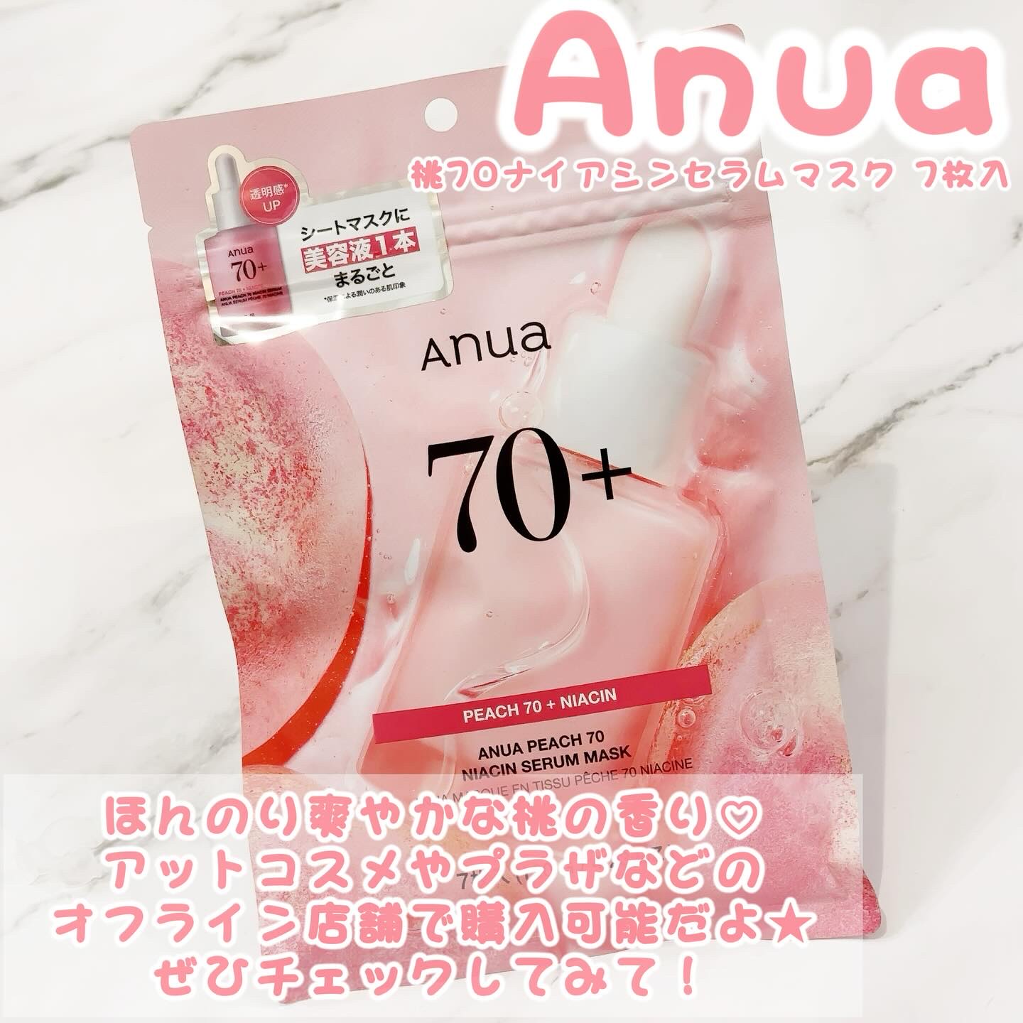 最近人気のアヌアのマスクパックを使ってみたよ😆肌悩みに合わせて毎日1枚ずつ、1週間の集中ケアが可能な7枚入ポーチタイプなんだ🍀色々種類があるんだけど、私はAnua桃70ナイアシンセラムマスクにしました❤️これ、桃70ナイアシ...