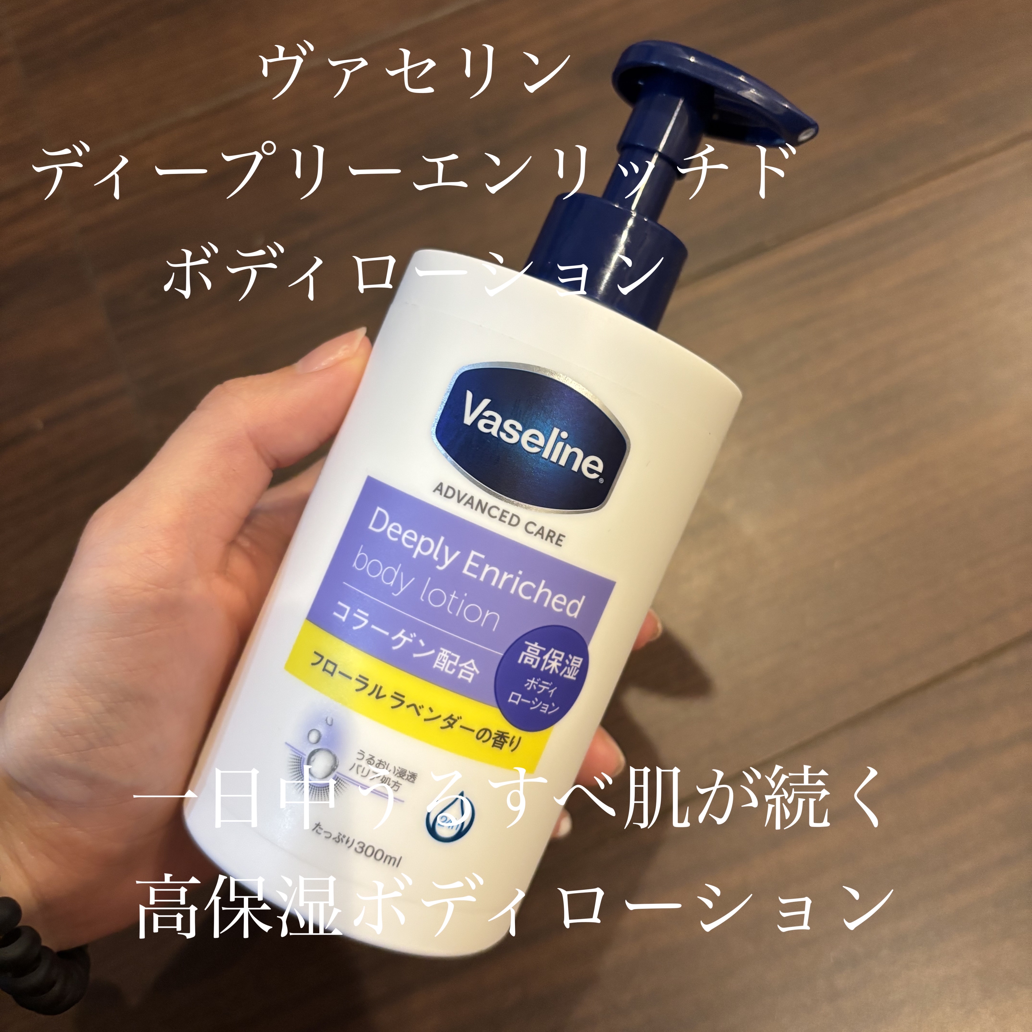- ヴァセリンジェリー*1高配合の高保湿ボディローションで、うるすべ肌が一日*2続きます。 ・コラーゲン*3に加え、カレンデュラエッセンス、オーガニックホホバオイル、オーガニックシアバターの3種の天然保湿成分を配合。 ・ラベンダーエッセンシャルオイル*4を配合した、心やすらぐフローラルラベンダーの香り ・スーッと肌*5に浸透してベタつかないのに、肌にしっかりうるおいを与えます。 *1: ワセリン:うるおい成分 *2: ユニリーバ・ジャパン調べ *3: うるおい成分 *4: 香り成分 *5: 角質層まで