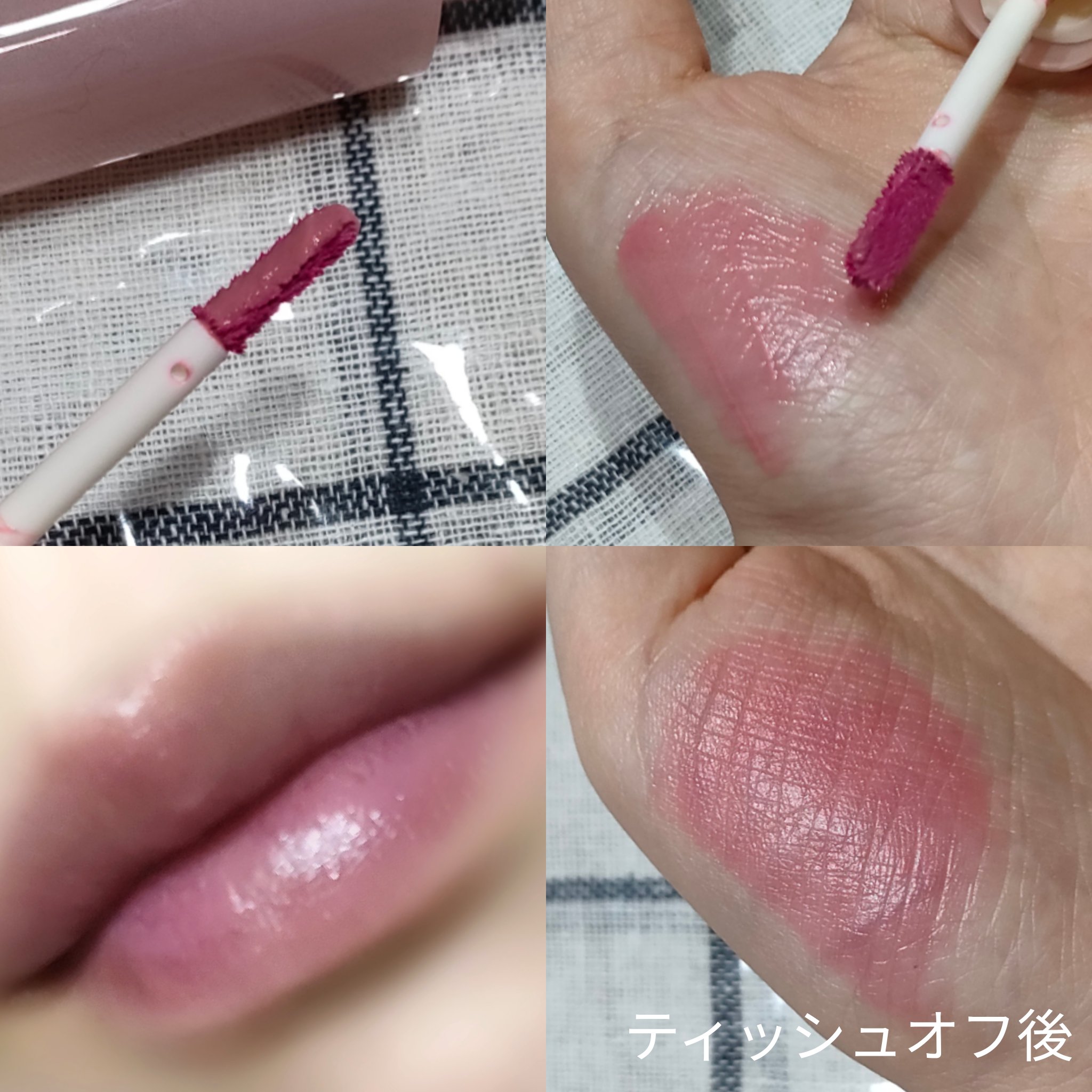 発色がとても良く、 塗ってすぐティッシュオフしてもかなり色が残っています。 うるっと感も残るのが良い! 唇では1度塗りティッシュオフだとムラがあったので繰り返して何度か塗ると良さそう✨ マンゴーのような甘ったるい香りだと感じました。 複数持った場合に見分けは付きにくくなるけどシンプルなパッケージも好き🥰