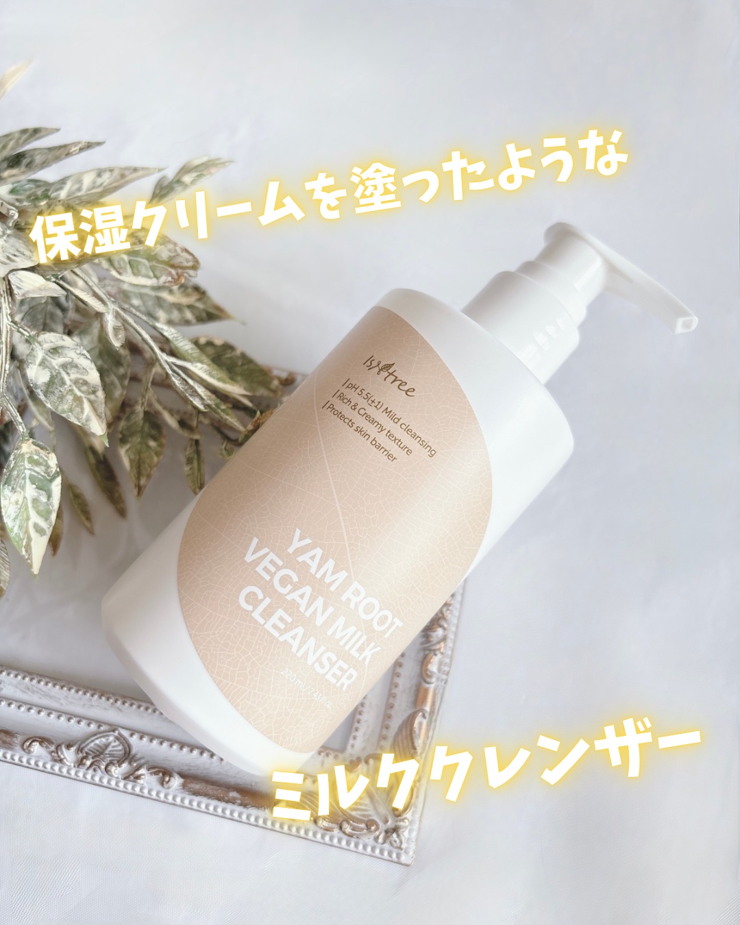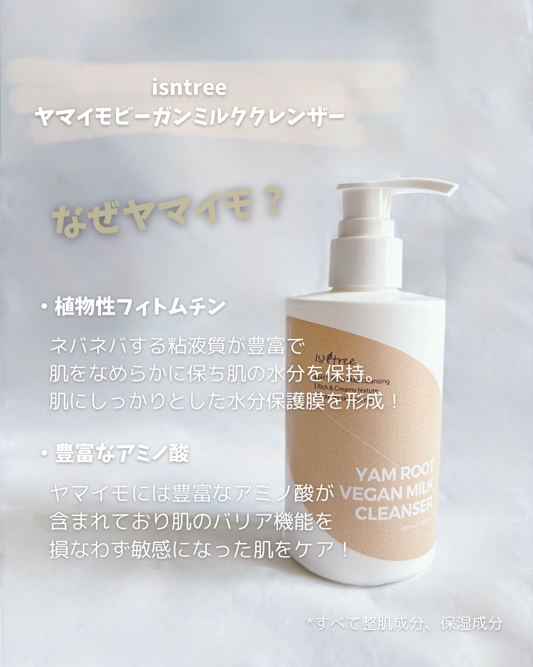 .✾isntree ヤマイモビーガンミルククレンザー..韓国ヤマイモの成分*1でしっとり洗顔ができる優れもの✨.PM2.5も洗浄してくれるらしい‼︎.水分保持力が高く植物性ムチン*2が高含有だから肌バリア機能を守りながら水分チャージしてくれる...