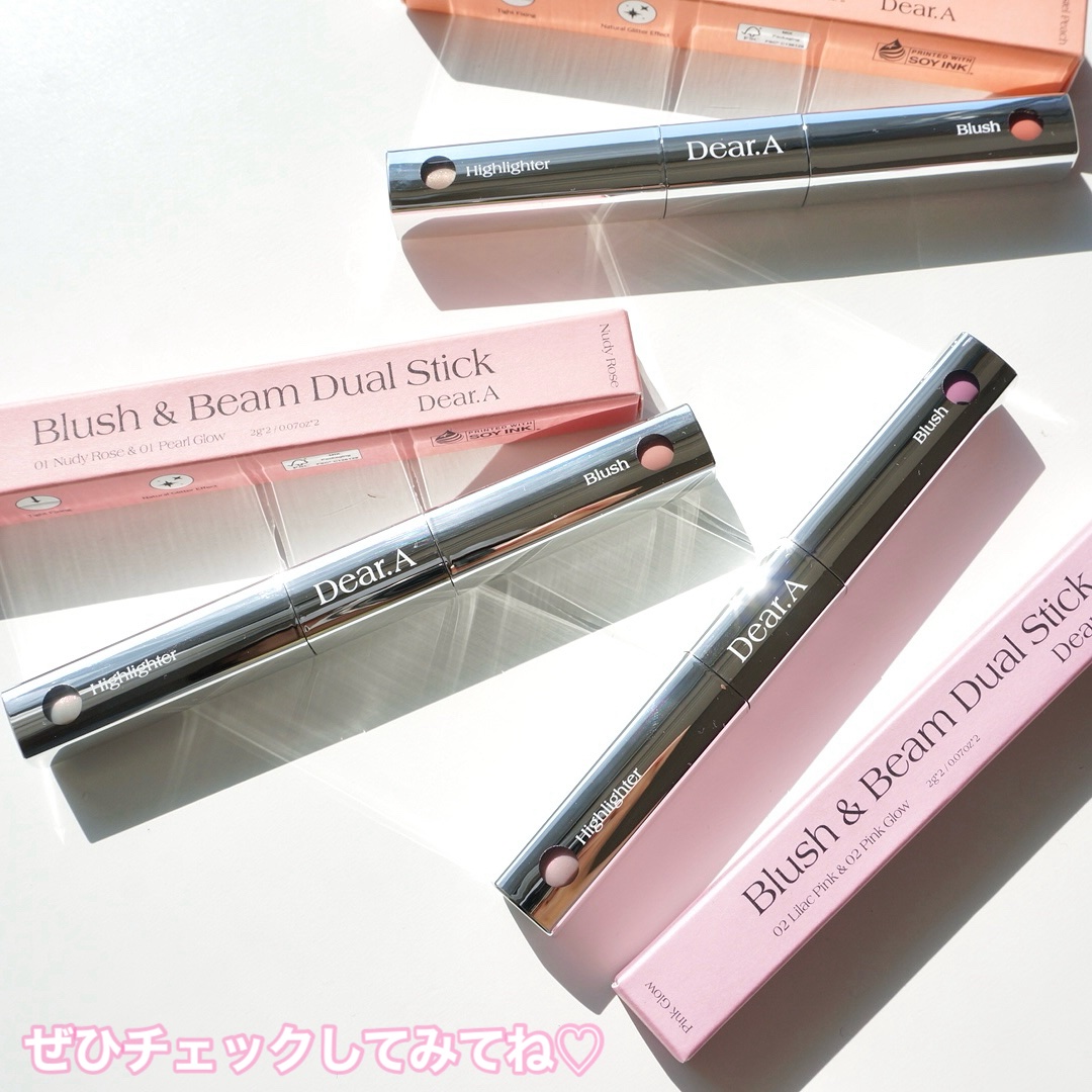 ツヤと血色をWで仕込む!Dear.Aブラッシュアンドビームデュアルスティック 02LilacPink&02PinkGlow🤍特徴🤍✔️チーク✕ハイライトのハイブリッドで叶える、血色ツヤ肌ハイライト🤍使用感🤍リキッドタイプで、香りは...