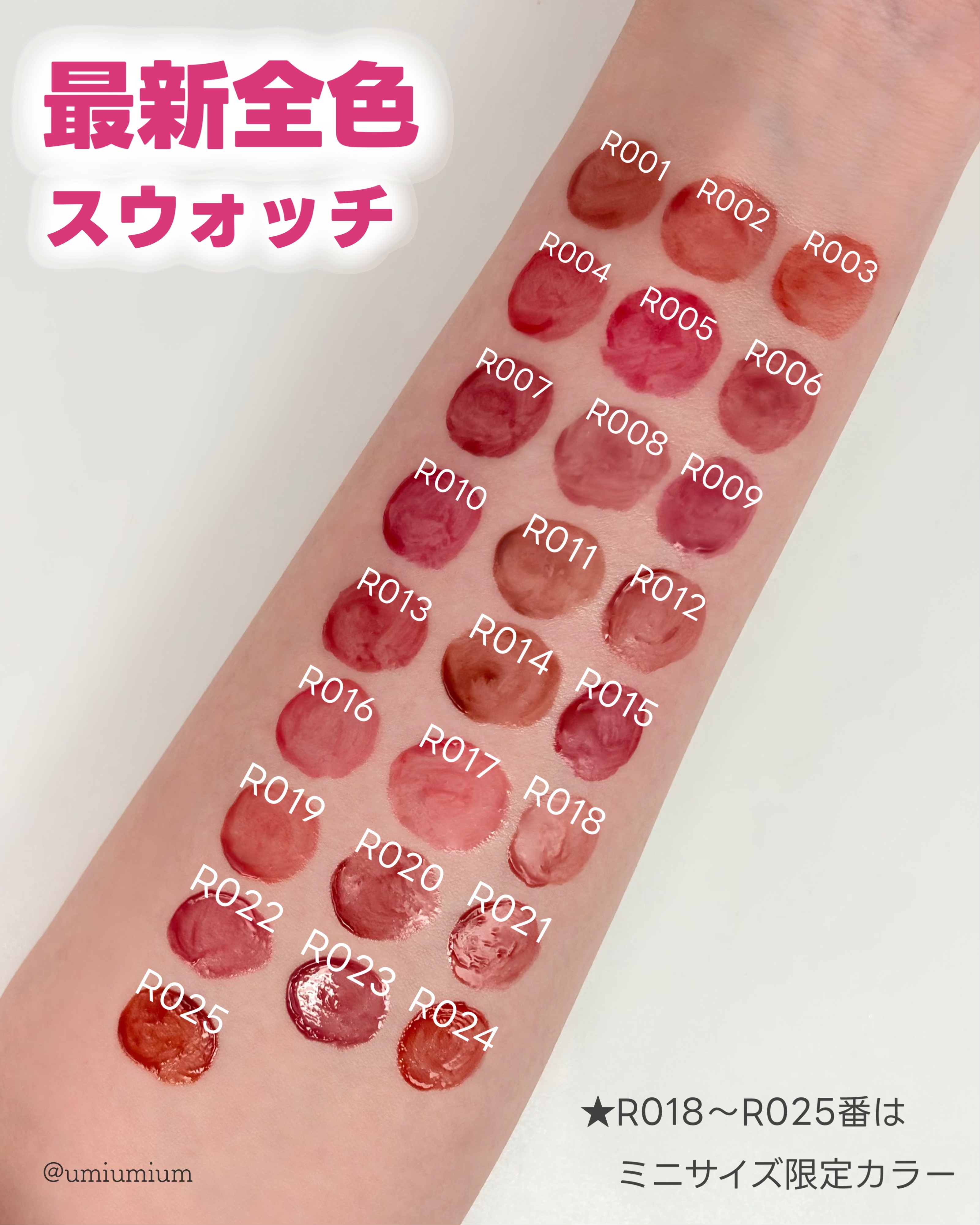 - <R001 ベア> 水、ジフェニルジメチコン、オクチルドデカノール、ビスジグリセリルポリアシルアジペート-2、リンゴ酸ジイソステアリル、トリメチルシロキシフェニルジメチコン、水添ポリイソブテン、ジグリセリン、ポリソルベート60、BG、セチルPEG/PPG-10/1ジメチコン、1,2-ヘキサンジオール、ペンチレングリコール、(アクリル酸ヒドロキシエチル/アクリロイルジメチルタウリンNa)コポリマー、セテアレス-20、スクワラン、フェノキシエタノール、酸化チタン、香料、エチルヘキシルグリセリン、黄5、赤227、イソステアリン酸ソルビタン、水酸化Al、ポリアクリル酸アンモニウム、酢酸トコフェロール、黄4、青1、ヒアルロン酸Na、(アルギニン/リシン)ポリペプチド、加水分解ヒアルロン酸、トコフェロール、アセチルヒアルロン酸Na、ソルビン酸 <R002 ロウローズ> 水、ジフェニルジメチコン、オクチルドデカノール、ビスジグリセリルポリアシルアジペート-2、リンゴ酸ジイソステアリル、トリメチルシロキシフェニルジメチコン、水添ポリイソブテン、ジグリセリン、ポリソルベート60、BG、セチルPEG/PPG-10/1ジメチコン、1,2-ヘキサンジオール、ペンチレングリコール、(アクリル酸ヒドロキシエチル/アクリロイルジメチルタウリンNa)コポリマー、セテアレス-20、スクワラン、フェノキシエタノール、酸化チタン、香料、エチルヘキシルグリセリン、黄5、赤227、イソステアリン酸ソルビタン、酢酸トコフェロール、水酸化Al、ポリアクリル酸アンモニウム、ヒアルロン酸Na、青1、加水分解ヒアルロン酸、(アルギニン/リシン)ポリペプチド、トコフェロール、アセチルヒアルロン酸Na、ソルビン酸 <R003 ロウプリコット> 水、ジフェニルジメチコン、オクチルドデカノール、ビスジグリセリルポリアシルアジペート-2、リンゴ酸ジイソステアリル、トリメチルシロキシフェニルジメチコン、水添ポリイソブテン、ジグリセリン、ポリソルベート60、BG、セチルPEG/PPG-10/1ジメチコン、1,2-ヘキサンジオール、ペンチレングリコール、(アクリル酸ヒドロキシエチル/アクリロイルジメチルタウリンNa)コポリマー、セテアレス-20、スクワラン、フェノキシエタノール、香料、エチルヘキシルグリセリン、酸化チタン、黄5、イソステアリン酸ソルビタン、赤227、酢酸トコフェロール、ヒアルロン酸Na、水酸化Al、ポリアクリル酸アンモニウム、加水分解ヒアルロン酸、青1、(アルギニン/リシン)ポリペプチド、トコフェロール、アセチルヒアルロン酸Na、ソルビン酸 <R004 フィーバー> 水、ジフェニルジメチコン、オクチルドデカノール、リンゴ酸ジイソステアリル、ビスジグリセリルポリアシルアジペート-2、トリメチルシロキシフェニルジメチコン、水添ポリイソブテン、ジグリセリン、ポリソルベート60、BG、セチルPEG/PPG-10/1ジメチコン、1,2-ヘキサンジオール、ペンチレングリコール、(アクリル酸ヒドロキシエチル/アクリロイルジメチルタウリンNa)コポリマー、セテアレス-20、スクワラン、フェノキシエタノール、香料、エチルヘキシルグリセリン、黄5、赤227、イソステアリン酸ソルビタン、酢酸トコフェロール、ヒアルロン酸Na、加水分解ヒアルロン酸、(アルギニン/リシン)ポリペプチド、トコフェロール、アセチルヒアルロン酸Na、ソルビン酸 <R005 ハイビスカス> 水、ジフェニルジメチコン、オクチルドデカノール、ビスジグリセリルポリアシルアジペート-2、リンゴ酸ジイソステアリル、トリメチルシロキシフェニルジメチコン、水添ポリイソブテン、ジグリセリン、ポリソルベート60、BG、セチルPEG/PPG-10/1ジメチコン、1,2-ヘキサンジオール、ペンチレングリコール、アクリル酸ヒドロキシエチル/アクリロイルジメチルタウリンNa)コポリマー、セテアレス-20、スクワラン、フェノキシエタノール、香料、エチルヘキシルグリセリン、赤227、黄5、イソステアリン酸ソルビタン、赤104(1)、酢酸トコフェロール、ヒアルロン酸Na、加水分解ヒアルロン酸、(アルギニン/リシン)ポリペプチド、トコフェロール、アセチルヒアルロン酸Na、ソルビン酸 <R006 ロウグレープ> 水、ジフェニルジメチコン、ビスジグリセリルポリアシルアジペート-2、リンゴ酸ジイソステアリル、オクチルドデカノール、トリメチルシロキシフェニルジメチコン、水添ポリイソブテン、ジグリセリン、ポリソルベート60、BG、セチルPEG/PPG-10/1ジメチコン、1,2-ヘキサンジオール、ペンチレングリコール、(アクリル酸ヒドロキシエチル/アクリロイルジメチルタウリンNa)コポリマー、セテアレス-20、スクワラン、酸化チタン、フェノキシエタノール、香料、エチルヘキシルグリセリン、黄5、赤227、イソステアリン酸ソルビタン、水酸化Al、ポリアクリル酸アンモニウム、酢酸トコフェロール、ヒアルロン酸Na、青1、加水分解ヒアルロン酸、(アルギニン/リシン)ポリペプチド、トコフェロール、アセチルヒアルロン酸Na、ソルビン酸 <R007 チル> 水、ジフェニルジメチコン、オクチルドデカノール、ビスジ