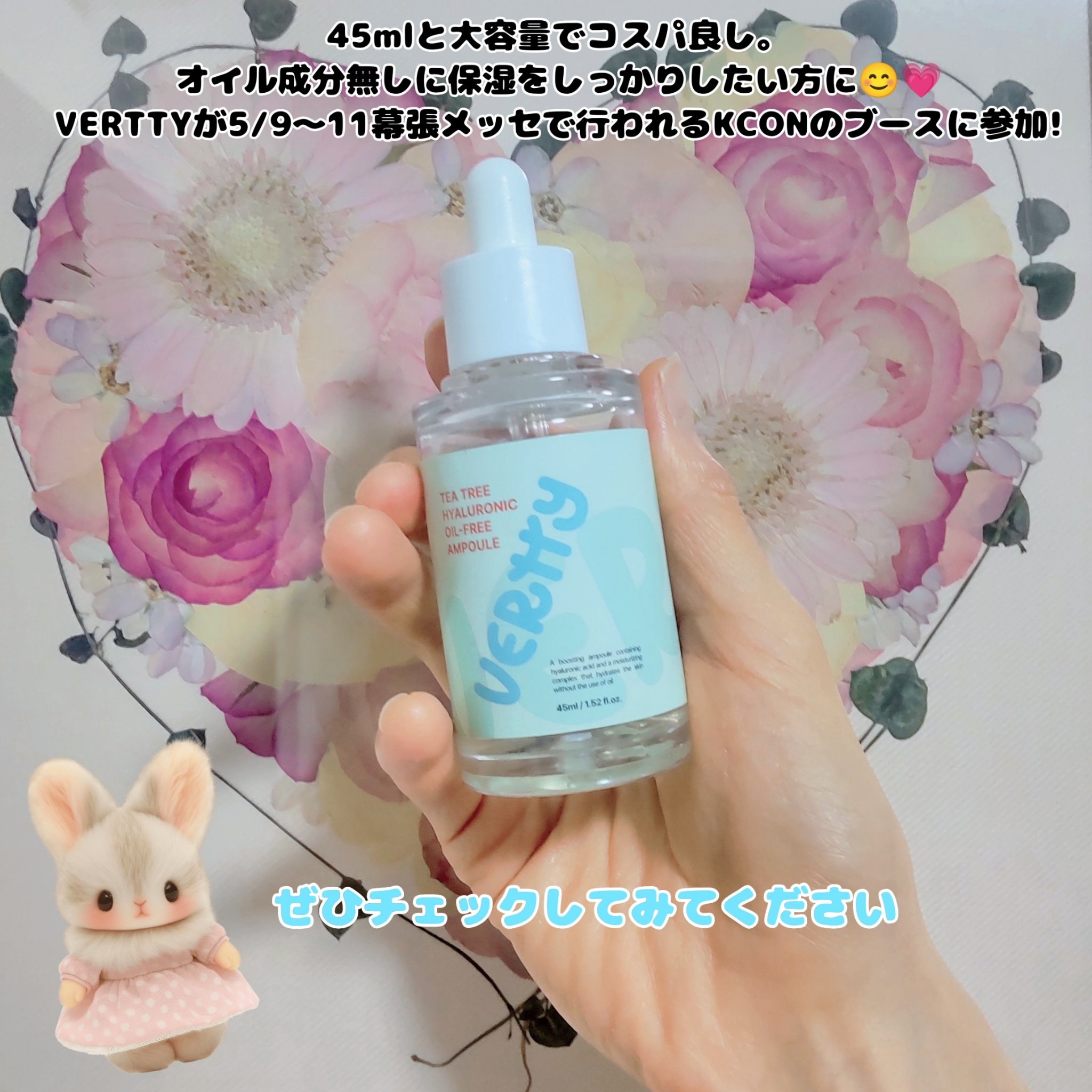 VERTTYティーツリーヒアルロニックオイルフリーアンプルVERTTYが5/9~11幕張メッセで行われるKCONのブースに参加します!オイルフリーのアンプルです。ウォータリーなテクスチャ。粘度ほんのりでサラッとしています。塗り広げやすくて伸ば...