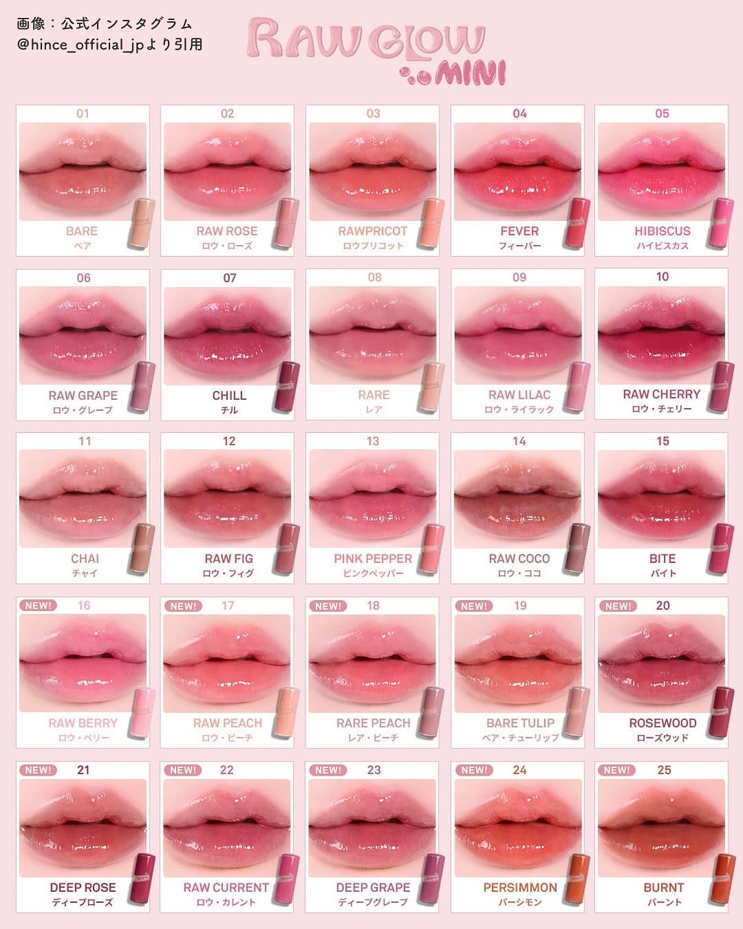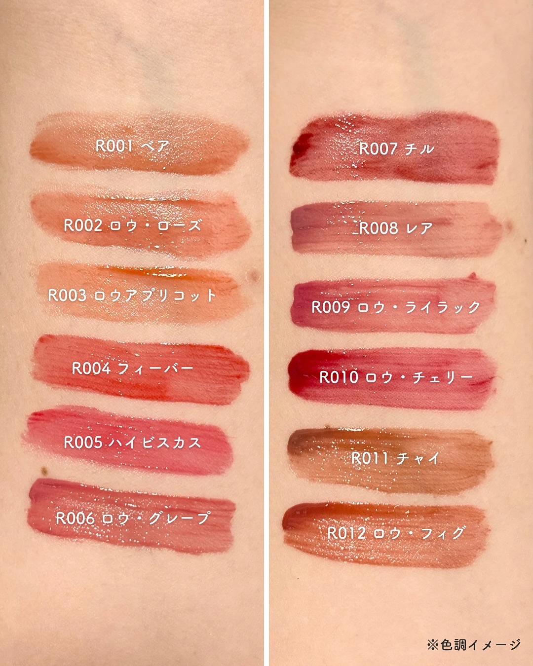 - <R001 ベア> 水、ジフェニルジメチコン、オクチルドデカノール、ビスジグリセリルポリアシルアジペート-2、リンゴ酸ジイソステアリル、トリメチルシロキシフェニルジメチコン、水添ポリイソブテン、ジグリセリン、ポリソルベート60、BG、セチルPEG/PPG-10/1ジメチコン、1,2-ヘキサンジオール、ペンチレングリコール、(アクリル酸ヒドロキシエチル/アクリロイルジメチルタウリンNa)コポリマー、セテアレス-20、スクワラン、フェノキシエタノール、酸化チタン、香料、エチルヘキシルグリセリン、黄5、赤227、イソステアリン酸ソルビタン、水酸化Al、ポリアクリル酸アンモニウム、酢酸トコフェロール、黄4、青1、ヒアルロン酸Na、(アルギニン/リシン)ポリペプチド、加水分解ヒアルロン酸、トコフェロール、アセチルヒアルロン酸Na、ソルビン酸 <R002 ロウローズ> 水、ジフェニルジメチコン、オクチルドデカノール、ビスジグリセリルポリアシルアジペート-2、リンゴ酸ジイソステアリル、トリメチルシロキシフェニルジメチコン、水添ポリイソブテン、ジグリセリン、ポリソルベート60、BG、セチルPEG/PPG-10/1ジメチコン、1,2-ヘキサンジオール、ペンチレングリコール、(アクリル酸ヒドロキシエチル/アクリロイルジメチルタウリンNa)コポリマー、セテアレス-20、スクワラン、フェノキシエタノール、酸化チタン、香料、エチルヘキシルグリセリン、黄5、赤227、イソステアリン酸ソルビタン、酢酸トコフェロール、水酸化Al、ポリアクリル酸アンモニウム、ヒアルロン酸Na、青1、加水分解ヒアルロン酸、(アルギニン/リシン)ポリペプチド、トコフェロール、アセチルヒアルロン酸Na、ソルビン酸 <R003 ロウプリコット> 水、ジフェニルジメチコン、オクチルドデカノール、ビスジグリセリルポリアシルアジペート-2、リンゴ酸ジイソステアリル、トリメチルシロキシフェニルジメチコン、水添ポリイソブテン、ジグリセリン、ポリソルベート60、BG、セチルPEG/PPG-10/1ジメチコン、1,2-ヘキサンジオール、ペンチレングリコール、(アクリル酸ヒドロキシエチル/アクリロイルジメチルタウリンNa)コポリマー、セテアレス-20、スクワラン、フェノキシエタノール、香料、エチルヘキシルグリセリン、酸化チタン、黄5、イソステアリン酸ソルビタン、赤227、酢酸トコフェロール、ヒアルロン酸Na、水酸化Al、ポリアクリル酸アンモニウム、加水分解ヒアルロン酸、青1、(アルギニン/リシン)ポリペプチド、トコフェロール、アセチルヒアルロン酸Na、ソルビン酸 <R004 フィーバー> 水、ジフェニルジメチコン、オクチルドデカノール、リンゴ酸ジイソステアリル、ビスジグリセリルポリアシルアジペート-2、トリメチルシロキシフェニルジメチコン、水添ポリイソブテン、ジグリセリン、ポリソルベート60、BG、セチルPEG/PPG-10/1ジメチコン、1,2-ヘキサンジオール、ペンチレングリコール、(アクリル酸ヒドロキシエチル/アクリロイルジメチルタウリンNa)コポリマー、セテアレス-20、スクワラン、フェノキシエタノール、香料、エチルヘキシルグリセリン、黄5、赤227、イソステアリン酸ソルビタン、酢酸トコフェロール、ヒアルロン酸Na、加水分解ヒアルロン酸、(アルギニン/リシン)ポリペプチド、トコフェロール、アセチルヒアルロン酸Na、ソルビン酸 <R005 ハイビスカス> 水、ジフェニルジメチコン、オクチルドデカノール、ビスジグリセリルポリアシルアジペート-2、リンゴ酸ジイソステアリル、トリメチルシロキシフェニルジメチコン、水添ポリイソブテン、ジグリセリン、ポリソルベート60、BG、セチルPEG/PPG-10/1ジメチコン、1,2-ヘキサンジオール、ペンチレングリコール、アクリル酸ヒドロキシエチル/アクリロイルジメチルタウリンNa)コポリマー、セテアレス-20、スクワラン、フェノキシエタノール、香料、エチルヘキシルグリセリン、赤227、黄5、イソステアリン酸ソルビタン、赤104(1)、酢酸トコフェロール、ヒアルロン酸Na、加水分解ヒアルロン酸、(アルギニン/リシン)ポリペプチド、トコフェロール、アセチルヒアルロン酸Na、ソルビン酸 <R006 ロウグレープ> 水、ジフェニルジメチコン、ビスジグリセリルポリアシルアジペート-2、リンゴ酸ジイソステアリル、オクチルドデカノール、トリメチルシロキシフェニルジメチコン、水添ポリイソブテン、ジグリセリン、ポリソルベート60、BG、セチルPEG/PPG-10/1ジメチコン、1,2-ヘキサンジオール、ペンチレングリコール、(アクリル酸ヒドロキシエチル/アクリロイルジメチルタウリンNa)コポリマー、セテアレス-20、スクワラン、酸化チタン、フェノキシエタノール、香料、エチルヘキシルグリセリン、黄5、赤227、イソステアリン酸ソルビタン、水酸化Al、ポリアクリル酸アンモニウム、酢酸トコフェロール、ヒアルロン酸Na、青1、加水分解ヒアルロン酸、(アルギニン/リシン)ポリペプチド、トコフェロール、アセチルヒアルロン酸Na、ソルビン酸 <R007 チル> 水、ジフェニルジメチコン、オクチルドデカノール、ビスジ