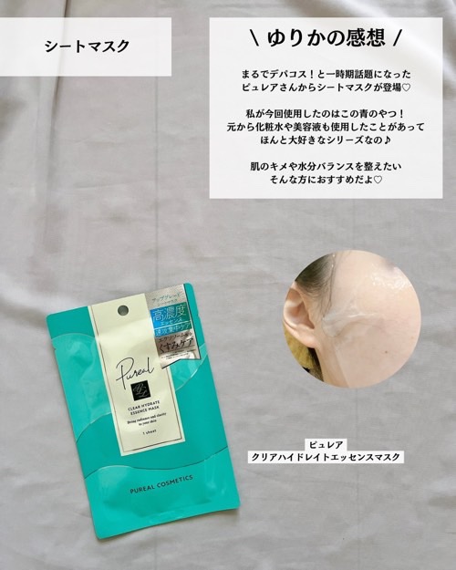 🌙ピュレアクリアハイドレイトエッセンスマスクデパコス級!って話題のピュレアのクリアエッセンスマスクがアップグレード*✨保湿成分配合のフェイスマスクで保湿してお肌を整えてくれます✔️薄いんだけどぷるんとした、まるでクラゲのようなシートに美容液が...