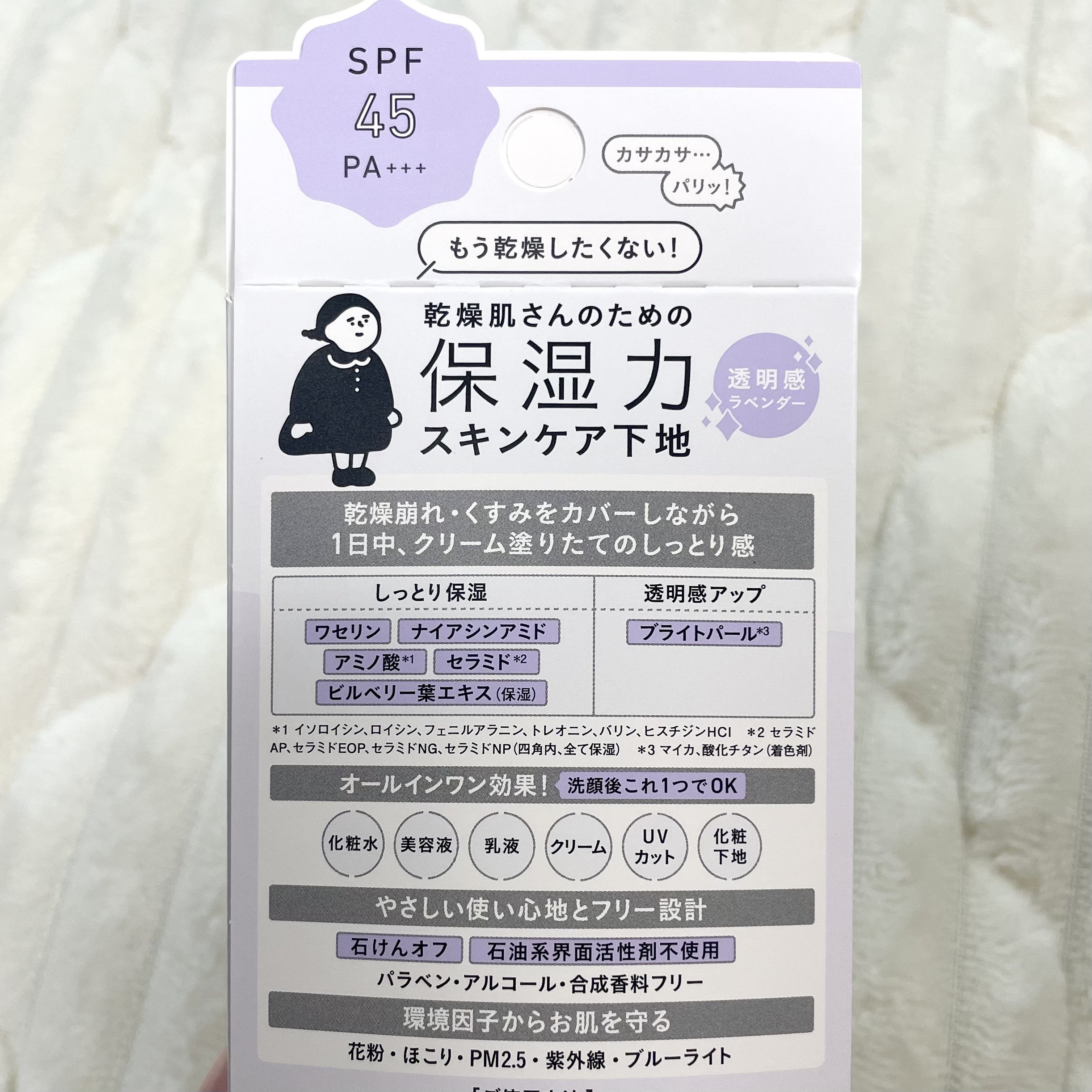 - もう乾燥したくない! ブライトパール配合のラベンダーカラーで透明感*1 アップ。 高保湿・高機能なベースメイク。 ●乾燥崩れ・くすみをカバーしながら、長時間しっとり 【しっとり保湿】 ワセリン・ナイアシンアミド・アミノ酸*2・セラミド*3・ビルベリー葉エキス(保湿) 【透明感*1 アップ】 ブライトパール*4 ●これ1つでOK!オールインワン効果 化粧品+美容液+乳液+クリーム+UVカット+化粧下地 ●SPF45、PA+++ ●やさしい使い心地とフリー設計 石けんオフ・石油系界面活性剤不使用・パラベン・アルコール・合成香料フリー ●環境因子からお肌を守る 花粉・ほこり・PM2.5・紫外線・ブルーライト *1 メイク効果による *2 イソロイシン、ロイシン、フェニルアラニン、バリン、ヒスチジンHCI *3 セラミドAP、セラミドEOP、セラミドNG、セラミドNP(全て保湿) *4 マイカ、酸化チタン(着色剤)