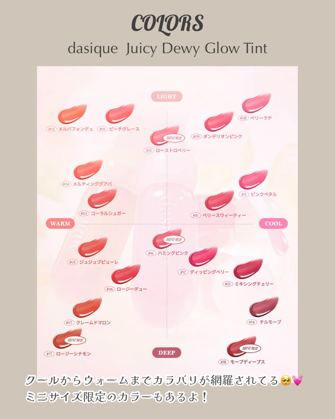 - 【夏新作2カラー登場!】 まるで果実のしずくがそのままリップになったような、みずみずしさと繊細なツヤを詰め込んだ「ジュージーデューイグロウティント」 夏新作で登場する新色「ベリーハート」、「タロミルク」は、透明感とふんわりとした色づきを徹底的にこだわって、何度もテストを重ねて生まれた特別なクールトーンカラー。 ひと塗りで唇をうるおし、重ねても重くならず、果実たっぷり!光をまとうような仕上がりに! - 蜂蜜に漬けた果物のように、うるちゅるふっくらとした果汁粘膜「ジューシーデュイグロウティント」 ミニだけの限定4色 15 ローストロベリー 16 ハミングピンク 17 ロージーシナモン 18 モーブディープス ♡唇に触れた途端、ぷるんと色っぽい果汁コーティング 果汁コーティングがじゅわっと唇に広がり、透明に輝くうるちゅる感を!蜂蜜に漬けた果物のようにぷるんぷるんとした唇を演出するグロウティント ♡イエベ、ブルべに合わせた多彩なカラーバリエーション 14色のカラーバリエーションで単独または、2色レイヤーリングして様々なリップメイクを演出 ♡ティント+リップグロスを一気に塗る効果! ティントの鮮やかな発色とリップグロスのうるうる透明ツヤ感が何度塗り重ねてもべたつかせず、唇にピタッと密着! 2025年11月1日(土)より、Qoo10公式ショップおよび東京フラッグシップストアにて発売予定
