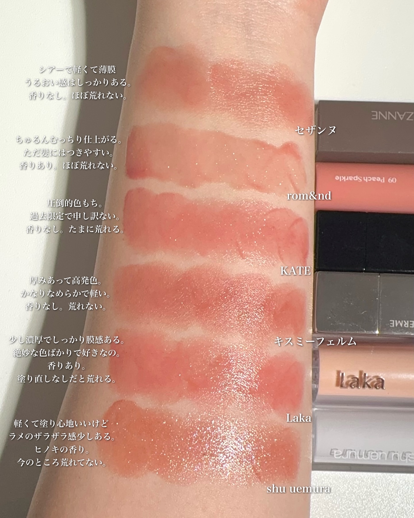 ねっちょりボリューム感あるテクスチャーだけど、ベタつきなく使いやすい。 ティントじゃない普通のグロスだから色もちは良くない。 発色ナチュラルだからこれだけでもいいけど、他のリップと合わせても可愛い!!