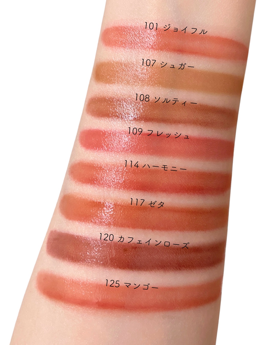 - <101 ジョイフル> 水、リンゴ酸ジイソステアリル、ダイマージリノール酸(フィトステリル/イソステアリル/セチル/ステアリル/ベヘニル)、ジイソステアリン酸ダイマージリノレイル、ノナイソステアリン酸ポリグリセリル-10、オクチルドデカノール、ビスジグリセリルポリアシルアジペート-2、水添ポリイソブテン、セチルPEG/PPG-10/1ジメチコン、ポリソルベート60(小麦由来)、イソステアリン酸ソルビタン(小麦由来)、1,2-ヘキサンジオール、グリセリン、ベヘニルアルコール、(アクリル酸/MA)コポリマーNa、ペンチレングリコール、BG、ポリアクリレート-13、トロメタミン、(アクリレーツ/アクリル酸アルキ ル(C10-30 )クロスポリマー、エチルヘキシルグリセリン、ポリイソブテン、(アクリル酸ヒドロキシエチル/アクリロイルジメチルタウリンNa)コポリマー、スクワラン、デヒドロ酢酸、ステビオシド、香料、フィチン酸、カプリリルグリコール、ジメチコン、水添ロジン酸メチル、水酸化Al、ポリソルベート20(小麦由来)、トコフェロール、ライム果汁、キイチゴ果汁、レモン果汁、マンゴー果汁、フラガリアチロエンシス果汁、アンズ果汁、オレンジ果汁、グレープフルーツ液汁、キウイ果汁、パパイア果汁、[+/-]酸化チタン、黄4、黄5、赤 104(1)、赤227、青1 <102 デューイ> 水、リンゴ酸ジイソステアリル、ダイマージリノール酸(フィトステリル/イソステアリル/セチル/ステアリル/ベヘニル)、ジイソステアリン酸ダイマージリノレイル、ノナイソステアリン酸ポリグリセリル-10、オクチルドデカノール、ビスジグリセリルポリアシルアジペート-2、水添ポリイソブテン、セチルPEG/PPG-10/1ジメチコン、ポリソルベート60(小麦由来)、イソステアリン酸ソルビタン(小麦由来)、1,2-ヘキサンジオール、グリセリン、ベヘニルアルコール、(アクリル酸/MA)コポリマーNa、ペンチレングリコール、BG、ポリアクリレート-13、トロメタミン、(アクリレーツ/アクリル酸アルキル(C10-30))クロスポリマー、エチルヘキシルグリセリン、ポリイソブテン、(アクリル酸ヒドロキシエチル/アクリロイルジメチルタウリンNa)コポリマー、スクワラン、デヒドロ酢酸、ステビオシド、香料、フィチン酸、ジメチコン、水添ロジン酸メチル、水酸化Al、カプリリルグリコール、ポリソルベート20(小麦由来)、トコフェロール、ライム果汁、キイチゴ果汁、レモン果汁、マンゴー果汁、フラガリアチロエンシス果汁、アンズ果汁、オレンジ果汁、グレープフルーツ液汁、キウイ果汁、パパイア果汁、酸化チタン、赤227、黄5、黄4、青1 <103 ハミング> 水、リンゴ酸ジイソステアリル、ダイマージリノール酸(フィトステリル/イソステアリル/セチル/ステアリル/ベヘニル)、ジイソステアリン酸ダイマージリノレイル、ノナイソステアリン酸ポリグリセリル-10、オクチルドデカノール、ビスジグリセリルポリアシルアジペート-2、水添ポリイソブテン、セチルPEG/PPG-10/1ジメチコン、ポリソルベート60(小麦由来)、イソステアリン酸ソルビタン(小麦由来)、1,2-ヘキサンジオール、グリセリン、ベヘニルアルコール、(アクリル酸/MA)コポリマーNa、ペンチレングリコール、BG、ポリアクリレート-13、トロメタミン、(アクリレーツ/アクリル酸アルキル(C10-30))クロスポリマー、エチルヘキシルグリセリン、ポリイソブテン、(アクリル酸ヒドロキシエチル/アクリロイルジメチルタウリンNa)コポリマー、スクワラン、デヒドロ酢酸、ステビオシド、香料、フィチン酸、ジメチコン、水添ロジン酸メチル、水酸化Al、カプリリルグリコール、ポリソルベート20(小麦由来)、トコフェロール、ライム果汁、キイチゴ果汁、レモン果汁、マンゴー果汁、フラガリアチロエンシス果汁、アンズ果汁、オレンジ果汁、グレープフルーツ液汁、キウイ果汁、パパイア果汁、酸化チタン、黄5、赤227、青1 <104 チェリー> 水、リンゴ酸ジイソステアリル、ダイマージリノール酸(フィトステリル/イソステアリル/セチル/ステアリル/ベヘニル)、ジイソステアリン酸ダイマージリノレイル、ノナイソステアリン酸ポリグリセリル-10、オクチルドデカノール、ビスジグリセリルポリアシルアジペート-2、水添ポリイソブテン、セチルPEG/PPG- 10/1ジメチコン、イソステアリン酸ソルビタン(小麦由来)、ポリソルベート60(小麦由来)、1,2-ヘキサンジオール、グリセリン、ベヘニルアルコール、(アクリル酸/MA)コポリマーNa、ペンチレングリコール、BG、ポリアクリレート-13、ト ロメタミン、(アクリレーツ/アクリル酸ア ルキル(C10-30))クロスポリマー、エチルヘキシルグリセリン、ポリイソブテ ン、(アクリル酸ヒドロキシエチル/アクリ ロイルジメチルタウリンNa)コポリマー、スクワラン、デヒドロ酢酸、ステビオシド、香料、カプリリルグリコール、ポリソルベー ト20(小麦由来)、トコフェロール、ライム果汁、キイチゴ果汁、レモン果汁、マンゴー 果汁、フラガリアチロエンシス果汁、アンズ 果汁、オレンジ果汁、グレープフルーツ液 汁、キウ