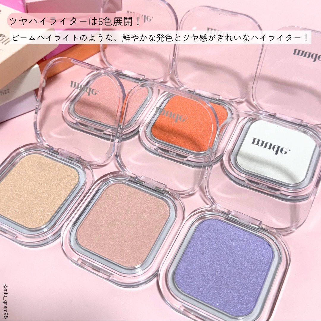 - <ツヤビームハイライト> 発光ビーム系ハイライトでまるでスポットライトが当たったようなツヤ感を演出。 繊細なパールが多幸感あふれる仕上がりを叶えます。 ハイライターとしてはもちろん、アイシャドウやチークにもオススメ。 <マットハイライト> 目的に合わせた2種のマットパウダーでまるでヴェールをかけたようなサテン肌に。 9月中旬より発売