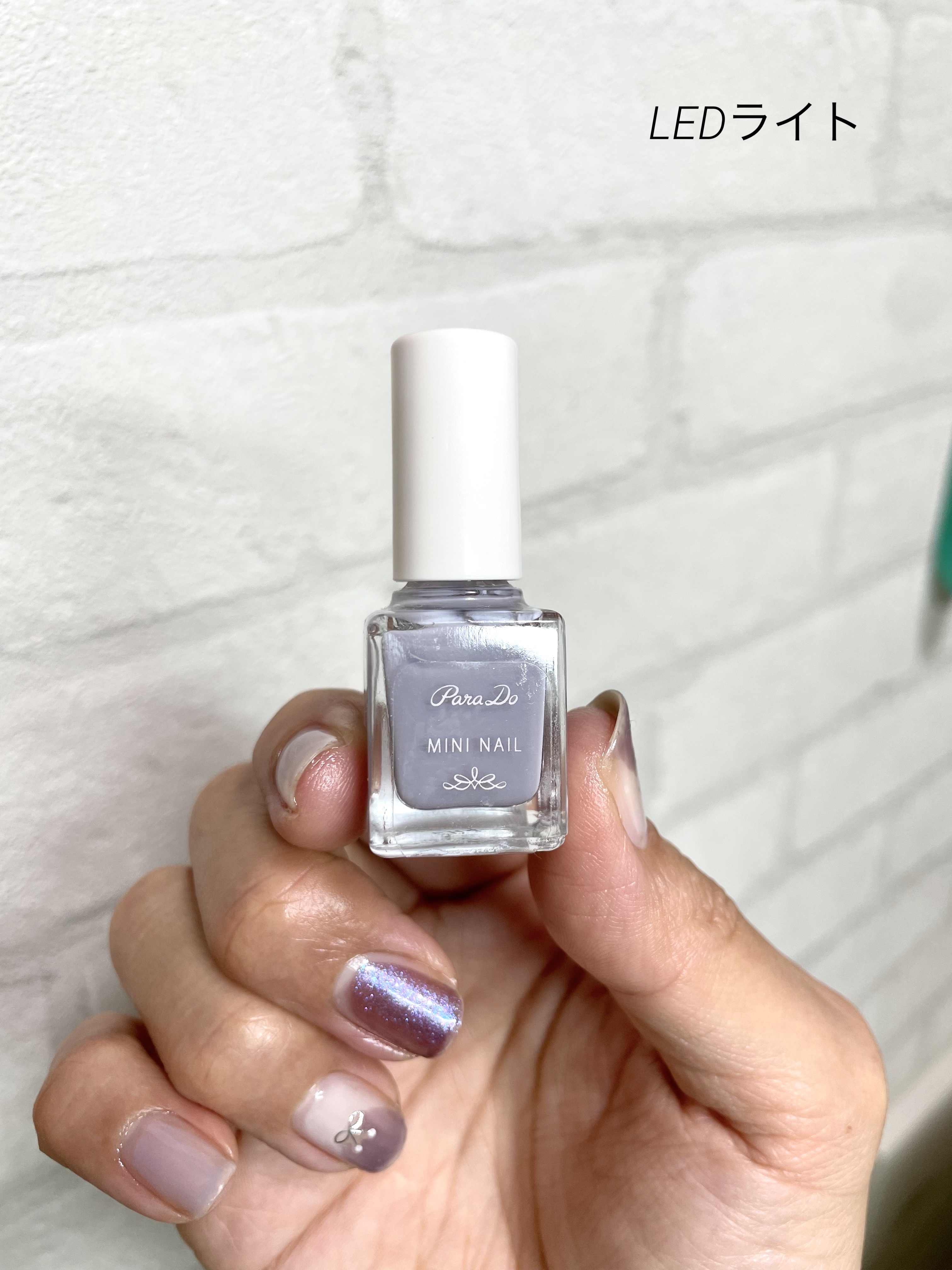 白っぽいパープルを1度塗り。乾いてからシアーなパープルを半円を描くように重ねます。 パラドゥミニネイル GY05グレームーンストーン PL08アサヤケソーダ ¥385 パープルネイル #桜色の春ネイル