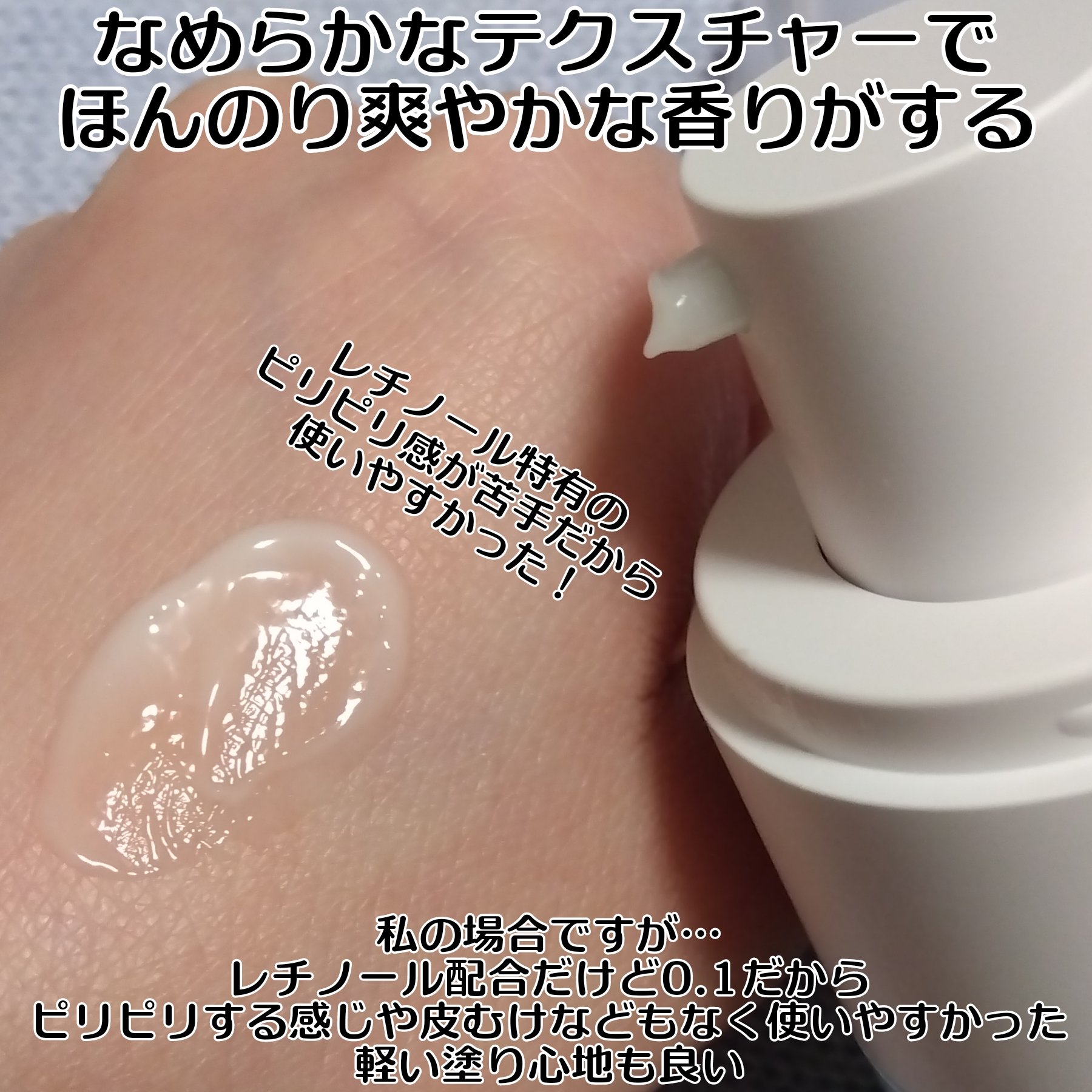 - こだわり成分配合◎パッケージにもこだわりをプラス♪ ●パッケージのポイント! エアレス容器でレチノール成分*を守り、鮮度の高い成分をそのまま肌へ届けます。 心地よく馴染み肌のキメを整える - 水分たっぷりの使用感でべたつきにくい! - しっとり肌の角質層隅々まで馴染み肌のキメが整った美肌に導いてくれます。 *整肌成分 使用方法 ◎ STEP1. エンドウ豆ほどに手に取り、気になる部分や顔全体に塗り広げます。