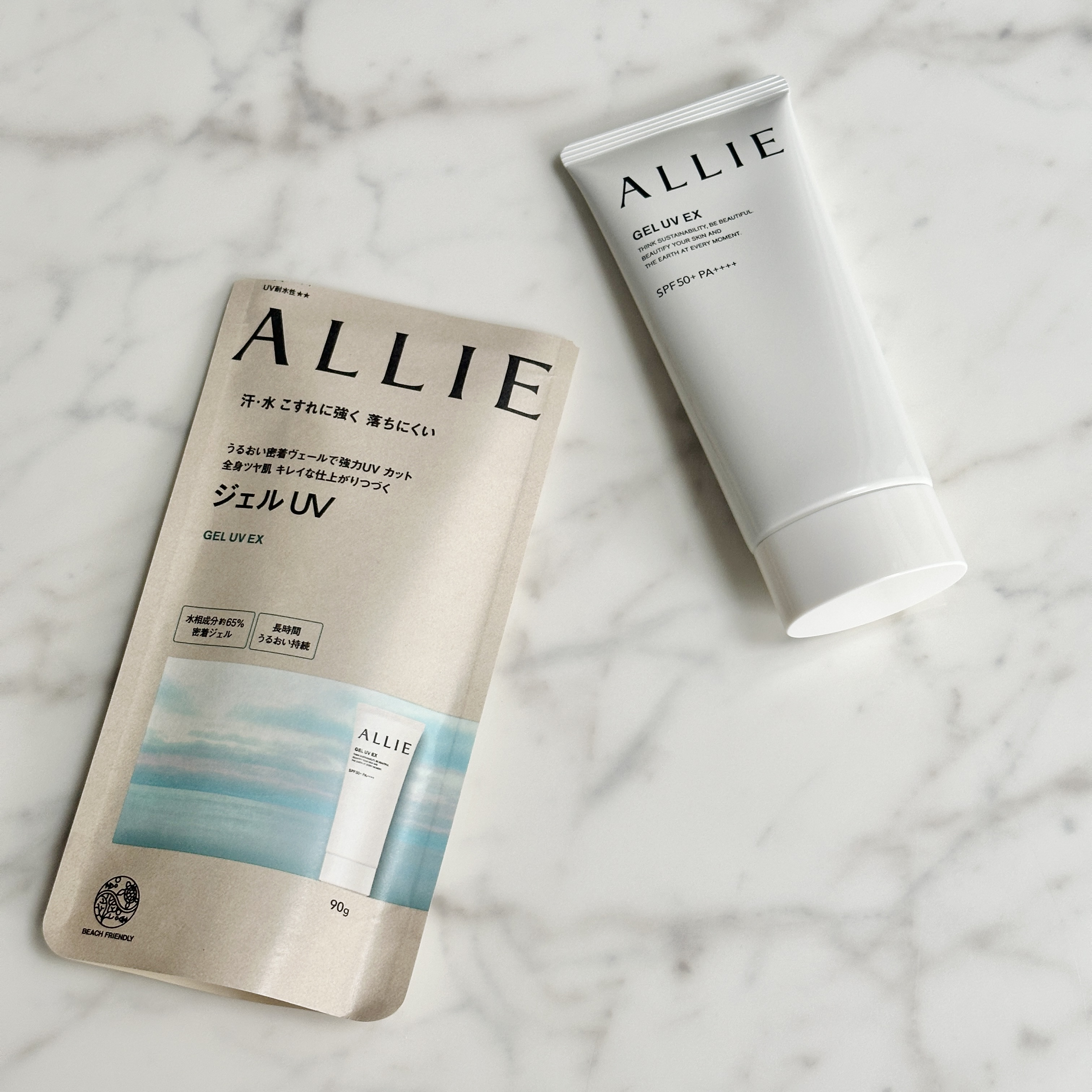 - 世界を想う 美しさつづく*1 日やけ止め おでかけには、落ちにくく、気持ちいい感触がつづく日やけ止めを。 一部の国・地域・ビーチの規制に配慮した設計のビーチフレンドリー処方。 汗・水・こすれにも強く、ベタつかずうるおう仕上がりが持続するジェル UV ●一部の国・地域・ビーチの規制に配慮した設計の「ビーチフレンドリー処方」 ●SPF50+・PA++++ ●汗・水 こすれに強く落ちにくい フリクションプルーフ・スーパーウォータープルーフ ●ベタつきにくい感触がつづく ●うるおい感のある肌仕上がりがつづく ●環境に配慮した素材を使用したパッケージ採用 ●美容液成分(保湿)ヒアルロン酸Na配合 ●顔・からだ用 ●洗顔料・ボディーソープで落とせる ●マスク・タオル等につきにくい ●化粧下地効果 ●無香料・無着色 ●チリ・ほこり・PM2.5・花粉等の微粒子汚れの付着を防ぐ*2 *1 スキンケア効果またはメイクアップ効果による肌仕上がりのこと *2 チリ・ほこり・PM2.5・花粉等すべての微粒子汚れの付着を防ぐわけではありません <限定セットA:セット内容> ・アリィー クロノビューティ ジェルUV EX 90g ・アリィー クロノビューティ ラスティングプライマーUV 5g ※セット商品の成分につきましては各商品ページでご確認ください。