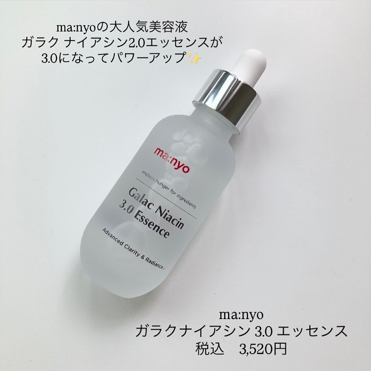 - ・manyoの独自成分!3倍*¹高濃縮でより強力な3世代ガラク 電気石を発酵器に添加し、微生物の成長に刺激を与えガラクトミセス菌の活性度増加!生長性の高いガラクトミセス菌株からガラクトミセス培養液*²を抽出し、肌のキメケアとともに透明感*³のあるお肌へ *¹ 3倍は高濃縮工程前、初期のガラクトミセス培養液(皮膚コンディショニング剤)と比較した場合 *² 皮膚コンディショニング剤 *³ キメが整った肌が与える印象のこと ・肌トーンケア*⁴、毛穴ケア*⁵、肌キメケア*⁶まで、保湿効果 3世代ガラク(Galactomy Active™ 7)と、ナイアシンアミド²配合で保湿成分をより強化し、くすんだ肌トーン*⁸から肌キメ、毛穴*⁵までケアします。 *⁴ 保湿により肌にツヤを与え明るい印象に見せること *⁵ 保湿することで肌をなめらかに整えツヤを与えることで毛穴を目立たなくすること *⁶ キメが整った素肌へ導くお手入れのこと *⁷ ガラクトミセス培養液、BG(どちらも皮膚コンディショニング剤)、1,2-ヘキサンジオール(溶剤) *⁸ 乾燥による ・水のようなさらっとしたテクスチャーで、べたつかず角質層まですっと浸透 保湿成分配合のウォータリーテクスチャーで、使用感は既存の「ガラク ナイアシン 2.0 エッセンス」と同じくさらっとした水のようなテクスチャー。角質層まで素早く浸透!べたつかない使用感で使いやすくて、角質層の奥まで潤い、表面はなめらかで整った肌へ 3月17日(月)からオフラインのバラエティショップで販売 3月24日(月)よりQoo10公式、楽天公式ショップで販売