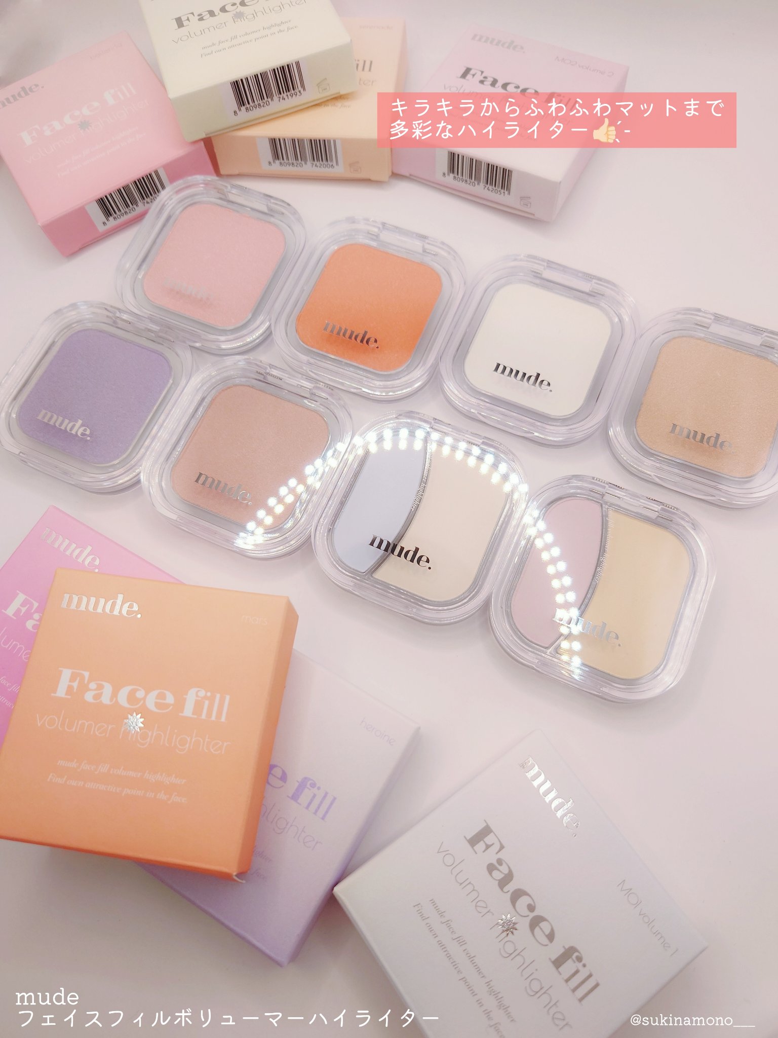 mudeの新作コスメはチェックした?🤩どの角度からも多彩に輝くきらきらパールハイライターが登場したよ✨フェイスフィルボリューマーハイライター🍑P01disco❤️🔥P02mars🦢P03pearfizz👒P04serenade🩰P05bal...
