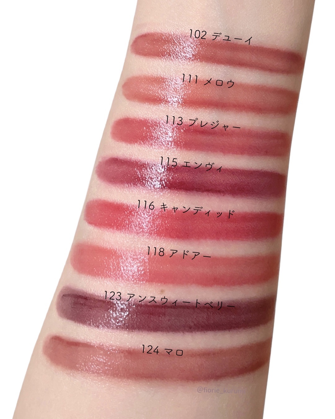 - <101 ジョイフル> 水、リンゴ酸ジイソステアリル、ダイマージリノール酸(フィトステリル/イソステアリル/セチル/ステアリル/ベヘニル)、ジイソステアリン酸ダイマージリノレイル、ノナイソステアリン酸ポリグリセリル-10、オクチルドデカノール、ビスジグリセリルポリアシルアジペート-2、水添ポリイソブテン、セチルPEG/PPG-10/1ジメチコン、ポリソルベート60(小麦由来)、イソステアリン酸ソルビタン(小麦由来)、1,2-ヘキサンジオール、グリセリン、ベヘニルアルコール、(アクリル酸/MA)コポリマーNa、ペンチレングリコール、BG、ポリアクリレート-13、トロメタミン、(アクリレーツ/アクリル酸アルキ ル(C10-30 )クロスポリマー、エチルヘキシルグリセリン、ポリイソブテン、(アクリル酸ヒドロキシエチル/アクリロイルジメチルタウリンNa)コポリマー、スクワラン、デヒドロ酢酸、ステビオシド、香料、フィチン酸、カプリリルグリコール、ジメチコン、水添ロジン酸メチル、水酸化Al、ポリソルベート20(小麦由来)、トコフェロール、ライム果汁、キイチゴ果汁、レモン果汁、マンゴー果汁、フラガリアチロエンシス果汁、アンズ果汁、オレンジ果汁、グレープフルーツ液汁、キウイ果汁、パパイア果汁、[+/-]酸化チタン、黄4、黄5、赤 104(1)、赤227、青1 <102 デューイ> 水、リンゴ酸ジイソステアリル、ダイマージリノール酸(フィトステリル/イソステアリル/セチル/ステアリル/ベヘニル)、ジイソステアリン酸ダイマージリノレイル、ノナイソステアリン酸ポリグリセリル-10、オクチルドデカノール、ビスジグリセリルポリアシルアジペート-2、水添ポリイソブテン、セチルPEG/PPG-10/1ジメチコン、ポリソルベート60(小麦由来)、イソステアリン酸ソルビタン(小麦由来)、1,2-ヘキサンジオール、グリセリン、ベヘニルアルコール、(アクリル酸/MA)コポリマーNa、ペンチレングリコール、BG、ポリアクリレート-13、トロメタミン、(アクリレーツ/アクリル酸アルキル(C10-30))クロスポリマー、エチルヘキシルグリセリン、ポリイソブテン、(アクリル酸ヒドロキシエチル/アクリロイルジメチルタウリンNa)コポリマー、スクワラン、デヒドロ酢酸、ステビオシド、香料、フィチン酸、ジメチコン、水添ロジン酸メチル、水酸化Al、カプリリルグリコール、ポリソルベート20(小麦由来)、トコフェロール、ライム果汁、キイチゴ果汁、レモン果汁、マンゴー果汁、フラガリアチロエンシス果汁、アンズ果汁、オレンジ果汁、グレープフルーツ液汁、キウイ果汁、パパイア果汁、酸化チタン、赤227、黄5、黄4、青1 <103 ハミング> 水、リンゴ酸ジイソステアリル、ダイマージリノール酸(フィトステリル/イソステアリル/セチル/ステアリル/ベヘニル)、ジイソステアリン酸ダイマージリノレイル、ノナイソステアリン酸ポリグリセリル-10、オクチルドデカノール、ビスジグリセリルポリアシルアジペート-2、水添ポリイソブテン、セチルPEG/PPG-10/1ジメチコン、ポリソルベート60(小麦由来)、イソステアリン酸ソルビタン(小麦由来)、1,2-ヘキサンジオール、グリセリン、ベヘニルアルコール、(アクリル酸/MA)コポリマーNa、ペンチレングリコール、BG、ポリアクリレート-13、トロメタミン、(アクリレーツ/アクリル酸アルキル(C10-30))クロスポリマー、エチルヘキシルグリセリン、ポリイソブテン、(アクリル酸ヒドロキシエチル/アクリロイルジメチルタウリンNa)コポリマー、スクワラン、デヒドロ酢酸、ステビオシド、香料、フィチン酸、ジメチコン、水添ロジン酸メチル、水酸化Al、カプリリルグリコール、ポリソルベート20(小麦由来)、トコフェロール、ライム果汁、キイチゴ果汁、レモン果汁、マンゴー果汁、フラガリアチロエンシス果汁、アンズ果汁、オレンジ果汁、グレープフルーツ液汁、キウイ果汁、パパイア果汁、酸化チタン、黄5、赤227、青1 <104 チェリー> 水、リンゴ酸ジイソステアリル、ダイマージリノール酸(フィトステリル/イソステアリル/セチル/ステアリル/ベヘニル)、ジイソステアリン酸ダイマージリノレイル、ノナイソステアリン酸ポリグリセリル-10、オクチルドデカノール、ビスジグリセリルポリアシルアジペート-2、水添ポリイソブテン、セチルPEG/PPG- 10/1ジメチコン、イソステアリン酸ソルビタン(小麦由来)、ポリソルベート60(小麦由来)、1,2-ヘキサンジオール、グリセリン、ベヘニルアルコール、(アクリル酸/MA)コポリマーNa、ペンチレングリコール、BG、ポリアクリレート-13、ト ロメタミン、(アクリレーツ/アクリル酸ア ルキル(C10-30))クロスポリマー、エチルヘキシルグリセリン、ポリイソブテ ン、(アクリル酸ヒドロキシエチル/アクリ ロイルジメチルタウリンNa)コポリマー、スクワラン、デヒドロ酢酸、ステビオシド、香料、カプリリルグリコール、ポリソルベー ト20(小麦由来)、トコフェロール、ライム果汁、キイチゴ果汁、レモン果汁、マンゴー 果汁、フラガリアチロエンシス果汁、アンズ 果汁、オレンジ果汁、グレープフルーツ液 汁、キウ