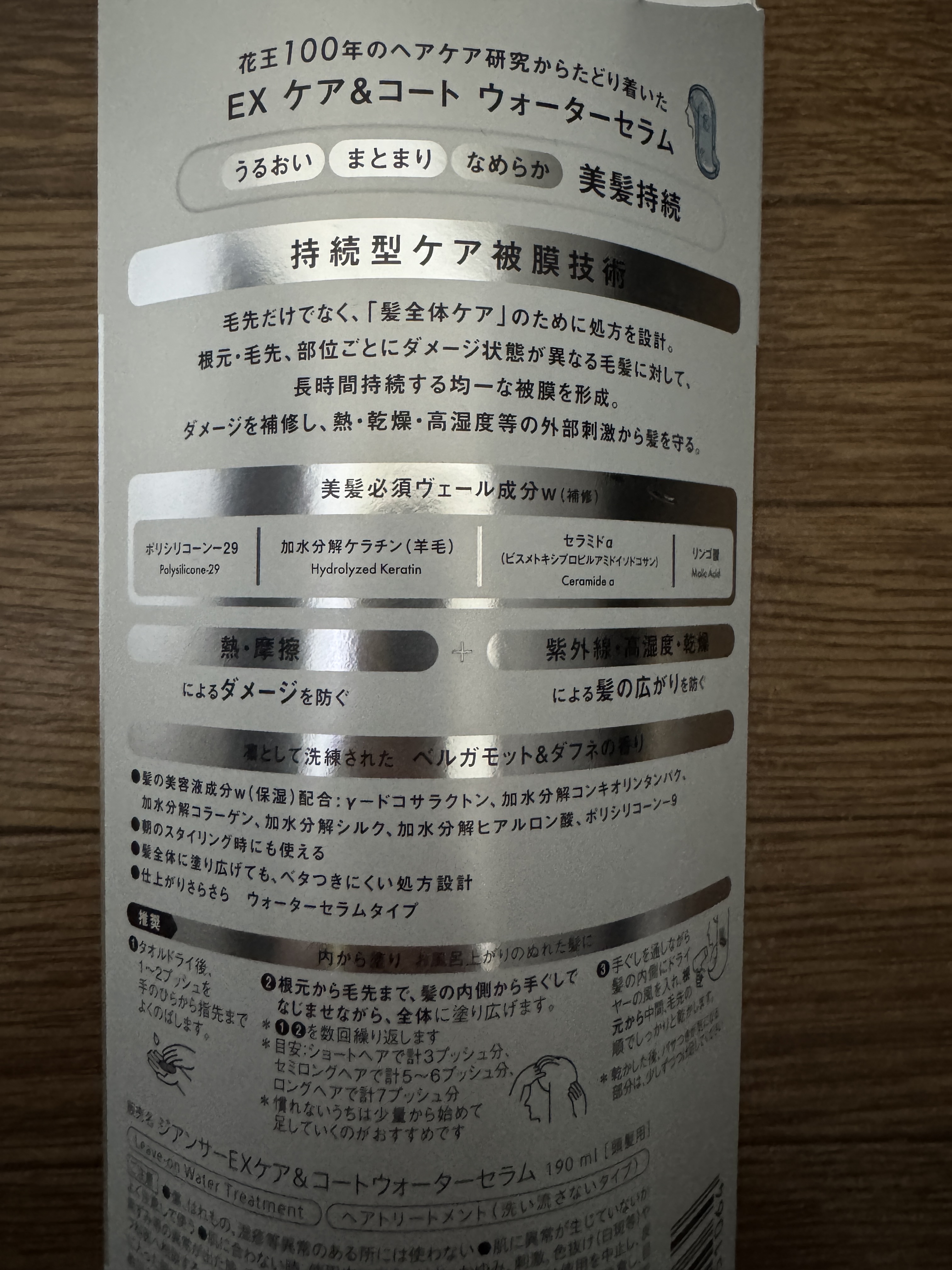 - 花王100年のヘアケア研究からたどり着いたヘアウォーターセラム うるおい、まとまり、なめらかな美しい髪へ導き、持続させる ●根元・毛先、部位ごとにダメージ状態が異なる毛髪に対して、長時間持続する均一な被膜を形成する「持続型ケア被膜技術」採用。毛先だけではなく、髪全体をケア ●美髪必須ヴェール成分w*¹(補修)、髪の美容液成分w*²(保湿)配合 ●熱・摩擦によるダメージを防ぐ ●熱・乾燥・高湿度等の外部刺激から髪を守る ●ベタつきにくい処方設計 ●朝のスタイリング時にも使える ●仕上がり さらさら ●凛として洗練されたベルガモット&ダフネの香り *¹ ポリシリコーン-29、加水分解ケラチン(羊毛)、セラミドα(ビスメトキシプロピルアミドイソドコサン)、リンゴ酸 *² γ-ドコサラクトン、加水分解コンキオリンタンパク、加水分解コラーゲン、加水分解シルク、加水分解ヒアルロン酸、ポリシリコーン-9