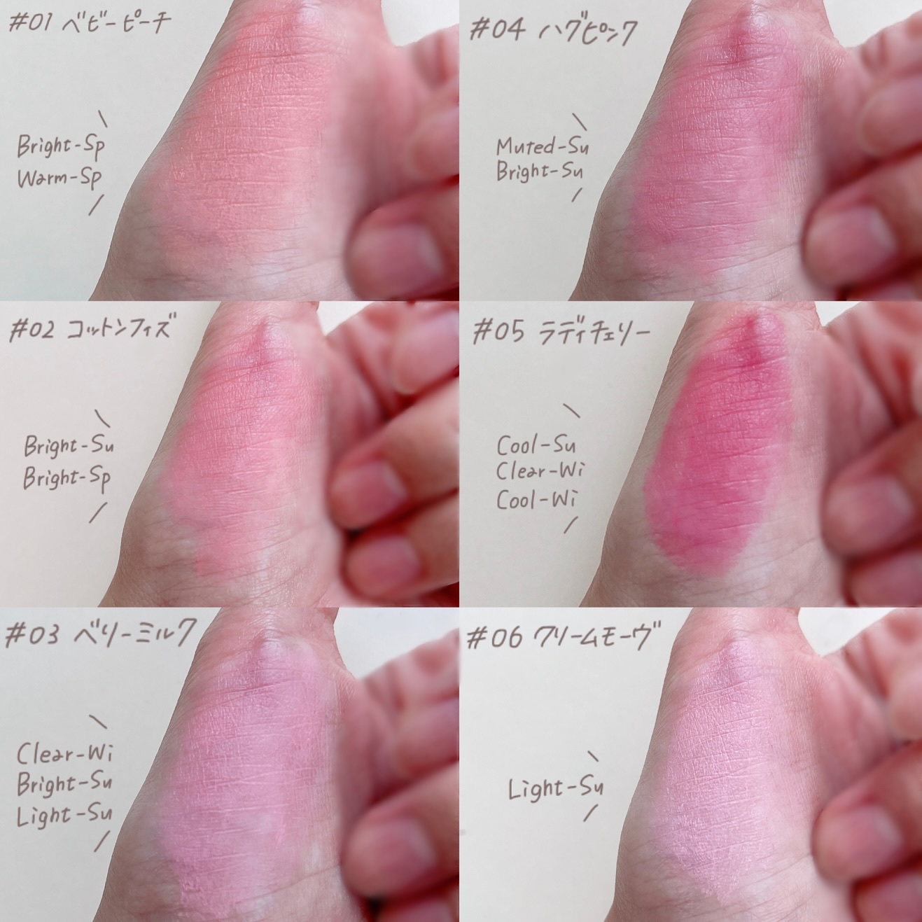 そしてまずね、このリップ ツヤ感がかなりしっかり出る。 すぐティッシュオフしたら 勿論ツヤ落ちるけど、 少し時間置いてからオフすると かなりツヤ感がちゃんと残る。 そして色持ちが驚異的!!! ビオデルマで擦っても かなりしっかり色が残って驚き😳 そして落ちてきても全然ムラにならない。 抜け感と自然な塗り心地の ケイトのリップモンスターとは また違ったタイプで、 しっかりな発色と密着感 瑞々しい塗り心地なメイベリン。 さて、65 生意気なスモーキーピンク。 これは全色の中で、ブルベ夏の方が 1番使いやすいのではって色。 発色はしっかりだけど ピンクベージュ系のカラーで 馴染みが良い◎ 80 独創的なローガンベリーは 鮮やかな青みのピンクレッド。 青み得意なウィンターさんや サマーの華やかリップにも◎