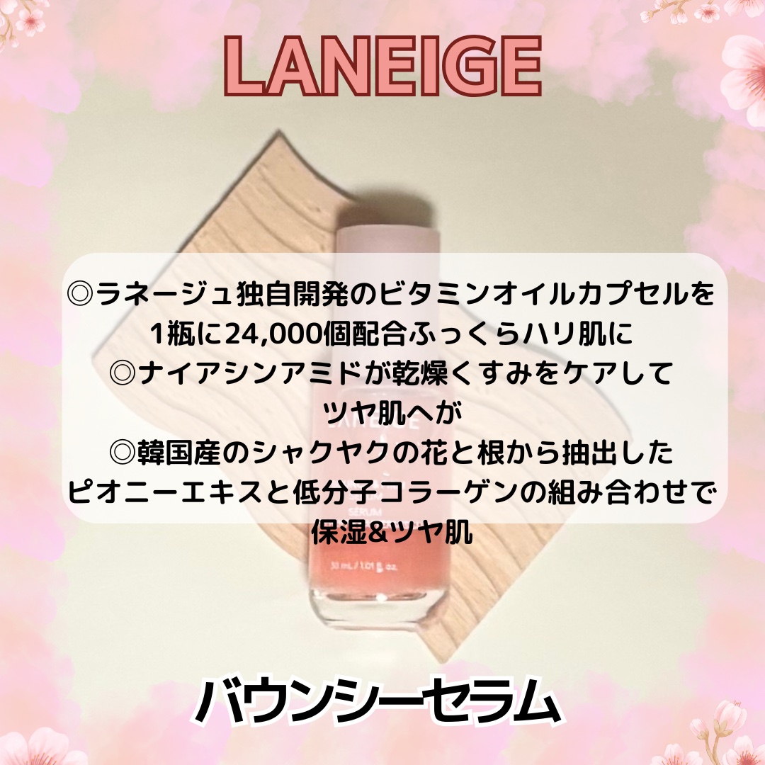 LANEIGEバウンシーセラム@laneige_jp様可愛いピンクのセラム💞とろみのあるテクスチャーで、お肌にしっとり馴染むのに軽い使用感でベタつき知らず!特に乾燥が気になる日のメイク前はファンデーションに1滴垂らすだけでファンデのノリも変わ...