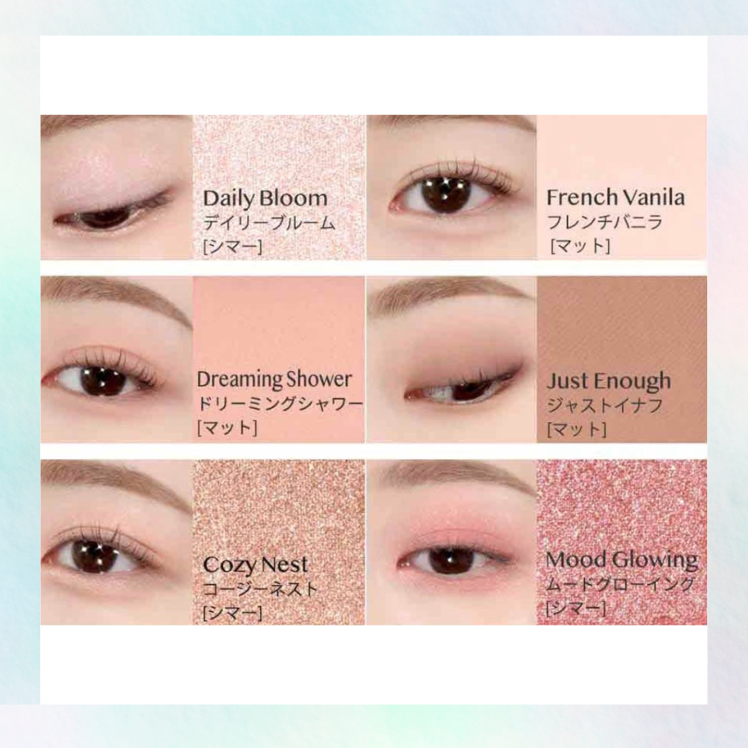 - 軽やかテクスチャーが目元に密着し、抜け感のある色使いが楽しめるデイリーパレット <101 ローズダイアリー(ROSE DIARY)> オーナメントを飾り付けたローズツリーのようにほのかに輝くウォームローズピンクカラー(イエベ秋)。 <102 ミュートアーカイブ(MUTE ARCHIVE)> 少女たちのピンキーなホームパーティームードを盛り込んだクールでヌーディーなミューテッドモブカラー(ブルべ夏ミュート)。 <103 バニラヘイズ(VANILLA HAZE)> 焼きたてのジンジャークッキーのように暖かく香ばしいウォームミュートカラー(イエベ秋ミュート)。 <104 GHR ピンク(GYEONGHOERU FLOWER FESTIVAL)> 春の日の美しく優雅な色を詰め込んだピンクカラーパレット。イエベ春&ブルベ夏におすすめのパレットです。 <105 DSG バイオレット(DEOKSUGUNG STONE WALL ROAD)> ほんのりピンクがかった柔らかなモーブカラーパレット。ブルベ夏&ブルベ冬におすすめのパレットです。 <106 DBG コーラル(GYEONGBOKGUNG STROLL)> 明るい日差しの色を取り入れたデイリーなコーラルカラー。イエベ春&ブライト秋におすすめのパレットです。
