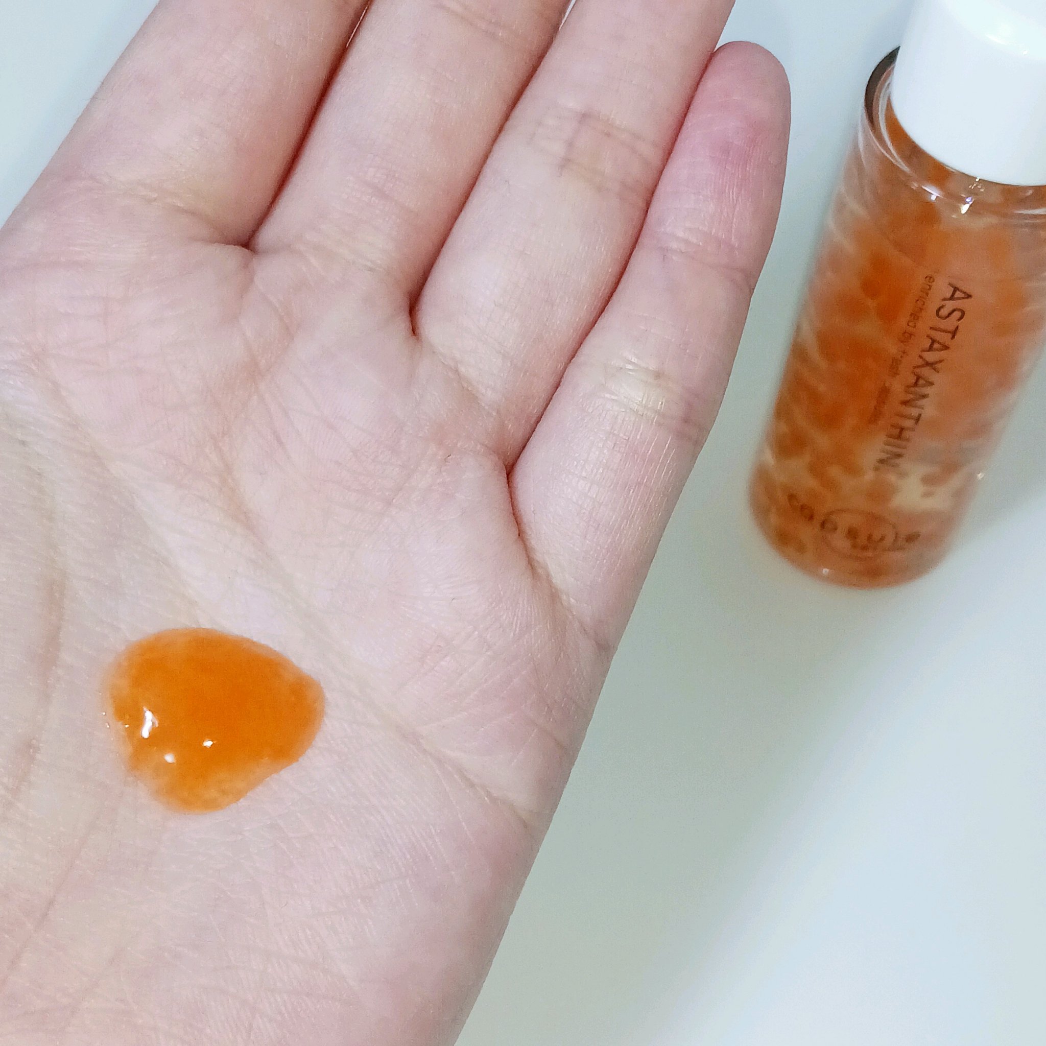 注目のエイジングケア成分 アスタキサンチンを厳正配合 中に小さいつぶつぶが美容液のカプセルで顔に馴染ませていくとプチプチと弾けて生美容液をお肌に届けてくれる◎ 伸びが良く、お肌にもすーっと入っていく感じでもっちりとしたお肌に仕上がります𓍯