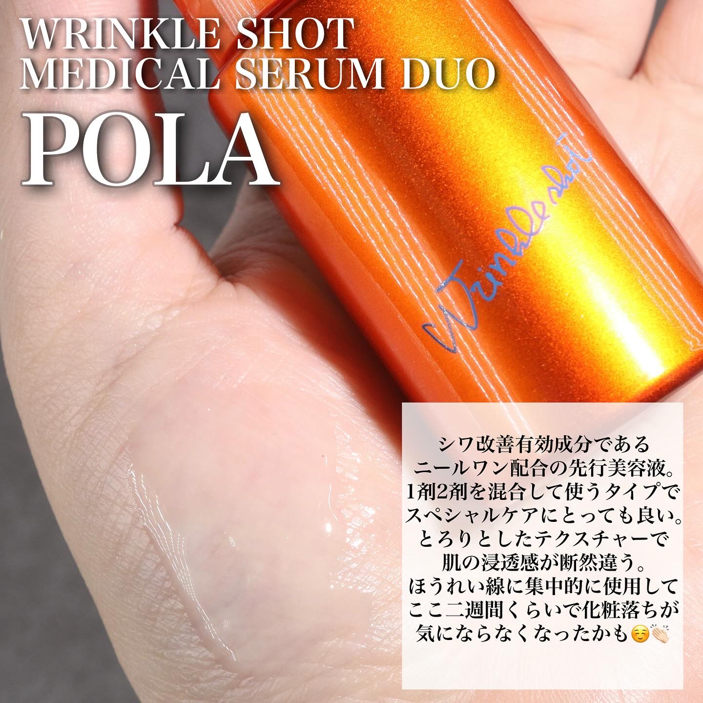 POLAさまからいただきました🎁リンクルショットメディカルセラムデュオ✨洗顔後すぐ、化粧水の前に使用する先行美容液。2剤を混ぜて30日を目安に使い切る処方。朝夕使用OK◎顔全体に使いやすい伸びのよいテクスチャーで散在シワやハリのなさにアプロー...